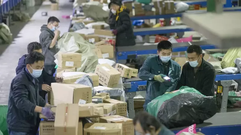 ▎图/2月18日,在扬州市江都邮政农村物流服务中心,邮政工作人员对包裹进行消杀。