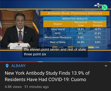 以上的例子,虽然不能用来断言夏天肯定就可以把病毒杀得落花流水,但是至少给我们提供很大的信心,希望北半球的这一波疫情,可以在夏天结束。但是,抗病毒除了天时、地利,还需要人和。如今新冠肺炎的规模是当年非典的规模的几百倍,虽然夏天能抑制病毒传播,但是很难期望能把病毒斩尽杀绝,尤其在病毒已经传播到南半球的情况下。等秋冬降临北半球时,新冠携手流感再次发起攻击,这种可能性是无法排除的。套用流感病毒的传播模式,新冠病毒就会成为一个季节性的传染病,甚至不只有第二波,可以每年有一次折腾。但是,要套用流感的模式,新冠就需要像流感病毒一样能折腾,但这并不确定。流感病毒在人类已经存在了很长时间,已有多种亚型存在,而且病毒本身也特别容易发生突变,不管是量变(抗原漂移),还是质变(抗原转变),都会导致之前已经产生的免疫力失效。正是因为这个原因,人体如果感染突变后的流感病毒,还是会再次发病。也正是因为这个原因,每年的冬季,都是流感季,而且因为每年流行的病毒亚型不同,也需要接种注射新的流感疫苗。新冠病毒虽然也会发生突变,但是突变的速度并没有流感病毒那么快,虽然目前新冠病毒的基因已经出现了不少亚型,但是并不意味着是不同的抗原亚型。因此,即便新冠病毒第二波再次来临,还是可以认为之前已经感染过的人,仍然具有免疫力。所以,如果在第一波感染之后已经形成了群体免疫,那第二波疫情就不会太严重。到底目前的感染率如何呢?从确诊数来推算,美国纽约州感染率比较高,有1.4%,其他州都不到1%,加州只有千分之一。但是有证据表明,如今的确诊数,可能远远低于实际的感染数。4月23日,纽约州州长Andrew Cuomo宣布,在该州进行的一项3000人的新冠病毒抗体筛查中,近14%的人检测结果呈阳性,如果细看纽约市的数据,阳性比例甚至高达21%。这意味着纽约州感染数可能是目前的10倍。![]()
