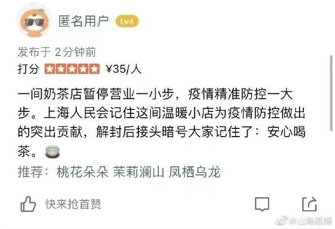 ▎这家奶茶店是自疫情爆发以来,出现过的占地面积最小的“中风险地区”,很多人把它看作为上海精准防疫的缩影。这家奶茶店被公示以来该店的老顾客以及网友们纷纷在评论区鼓励,“希望你们加油!上海加油!痊愈后,我们一起拔草庆功!”