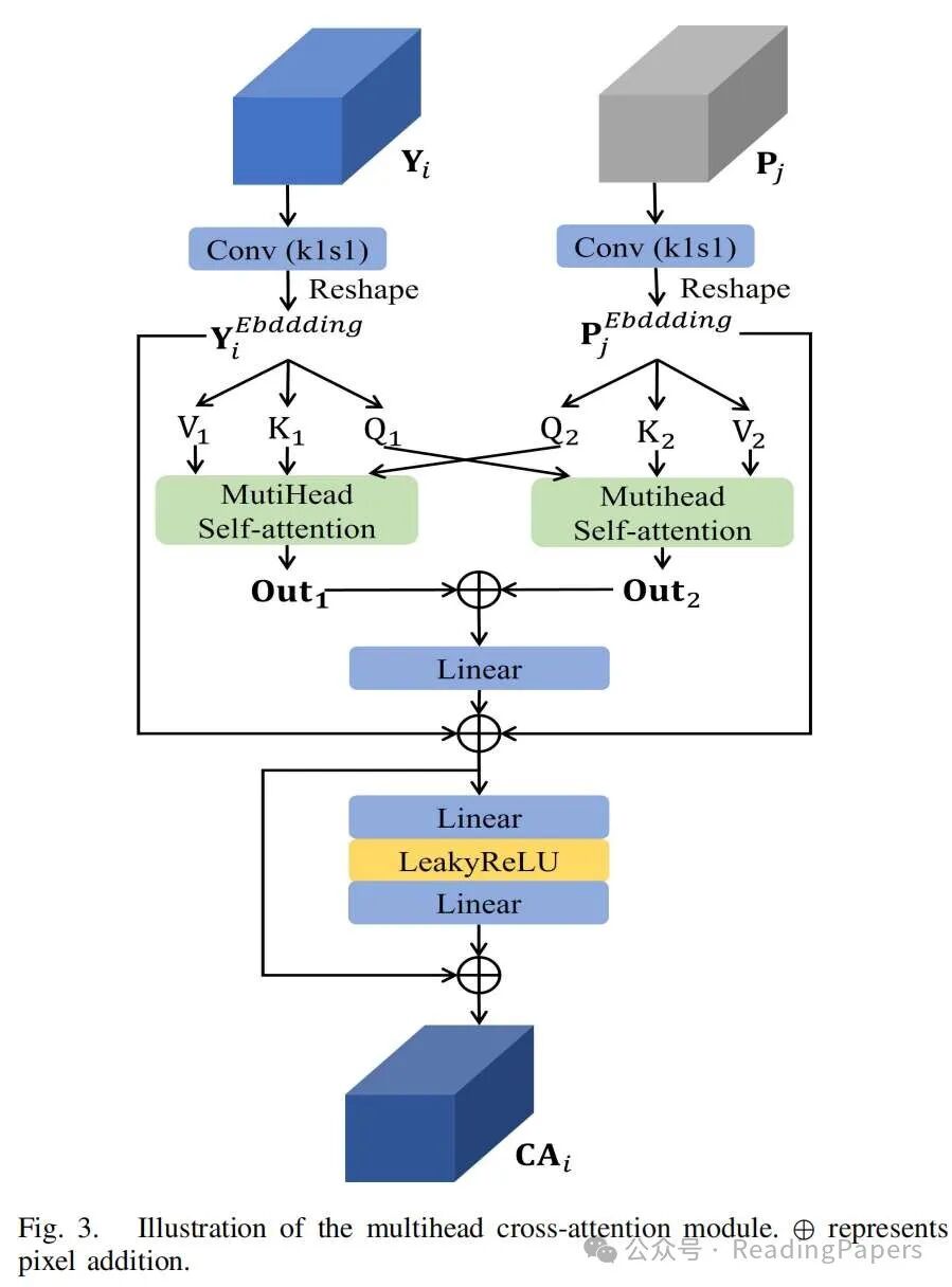 其中 表示卷积层,核心大小为3,步长为1, 表示LeakyReLU函数。Up表示使用核心大小为2,步长为2的2-D转置卷积层进行卷积上采样。Down表示使用核心大小为3,步长为2的2-D卷积层进行卷积下采样。 用于区分不同尺度的图像。对于Y,随着的增加,的图像尺寸增大。对于P,随着的增加,的图像尺寸减小。- 特征交互融合分支:在MFGB之后,可以获得多尺度光谱和空间信息,这将用作驱动实现多尺度交互融合技术的引导项目。具体来说,我们设计了一个多头交叉注意模块(见图3),它计算两个特征图在同一尺度上的长期相关性,以实现信息之间的长期交互。使用它来计算不同尺度的光谱和空间信息,可以获得不同尺度的交互结果。最后,通过对不同尺度的交互结果进行特征聚合操作,产生最终的融合图像(见图2)。