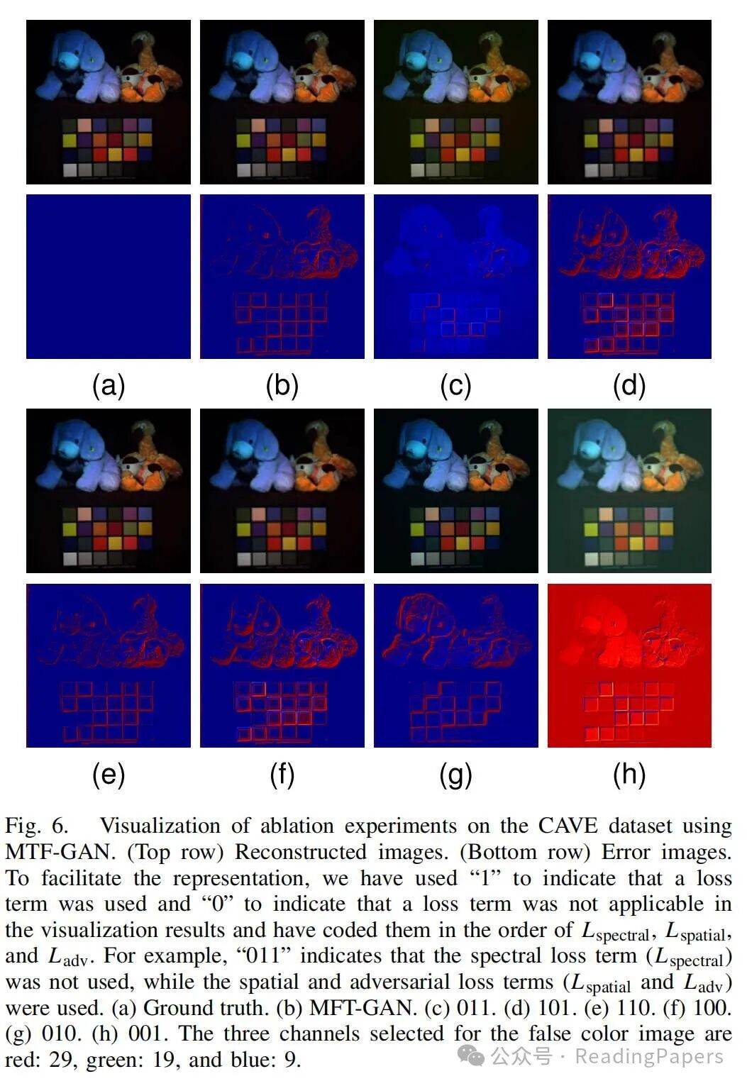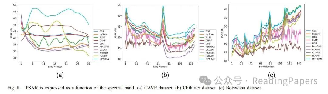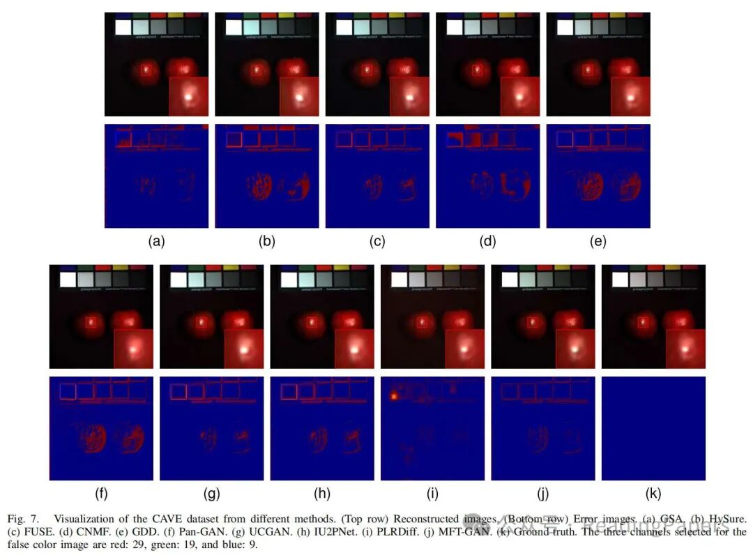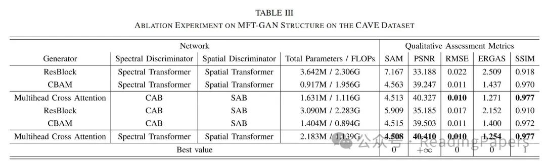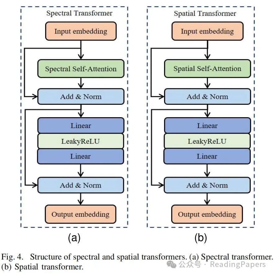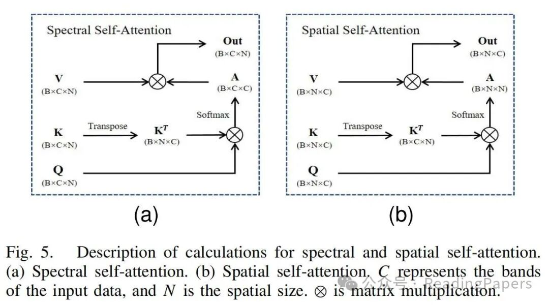 为了结构和参数平衡,我们将变换器集成到两个鉴别器中(见图2);这些鉴别器的详细结构如图4所示。我们可以看到,光谱和空间变换器使用不同的注意力机制,即光谱自注意力和空间自注意力,使用相同的公式[66]进行计算。如图5所示,输入数据具有不同的维度,计算不同的自注意力结果,从而允许获取长期光谱特征和长期空间特征。具体来说,光谱自注意力计算不同像素之间的光谱相关性,空间自注意力计算不同波段之间的空间相关性。这种计算可以更好地保留光谱和空间特征。光谱变换鉴别器用于区分插值上采样的LRHS图像()和生成的HRHS图像(F)为真或假。在图2和程序1中,我们可以看到光谱变换鉴别器的运行过程。与传统鉴别器不同,光谱变换鉴别器通过光谱变换模块迭代计算特征图的光谱长期相关性。在光谱变换的每次迭代中,参数不共享,因为输入维度不同。这种设计旨在通过逐渐降低维度来捕获不同像素维度之间的长期光谱特征,从而获得光谱水平上的优秀分类结果。空间变换鉴别器用于区分PAN图像(P)和生成的HRHS图像(PF)为真或假。在图2和程序2中,我们可以看到空间变换鉴别器的运行过程。像上面的理论一样,空间变换鉴别器也使用迭代计算策略,并且每次迭代的参数不共享。使用空间变换模块和平均池化操作获取不同光谱之间的长距离空间特征,实现空间水平上的优秀分类结果。最后,我们使用clip函数将两个鉴别器的分类结果映射到-1到1的范围,这确保了与铰链损失函数的兼容性,并有助于有效的模型训练。实验结果