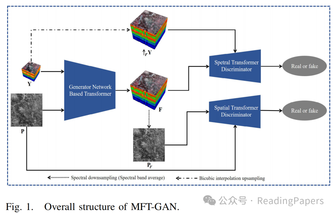 无监督学习,无需标记样本即可学习数据分布,是一种解决高光谱泛锐化挑战性任务的非常有前景的方法。受此启发,我们引入了一个创新的生成对抗网络框架(名为MFT-GAN),该框架整合了变换器网络和多尺度交互技术。具体来说,MFT-GAN由一个生成器和两个鉴别器组成。生成器由多尺度特征引导分支(MFGB)和特征交互融合分支(FIFB)组成。前者旨在通过卷积采样操作从低分辨率高光谱(LRHS)和全色(PAN)图像中提取光谱和空间信息分支。后者通过多尺度交互技术在不同尺度上实现光谱和空间信息的交互。然后,通过逐层卷积采样和像素求和操作将多尺度交互结果融合,以生成高分辨率高光谱(HRHS)图像。鉴别器由光谱变换鉴别器和空间变换鉴别器组成,旨在保持结构和参数平衡,并学习长期的光谱和空间相关关系。此外,使用混合损失函数来完成MFT-GAN的对抗性训练,以提高其性能。在模拟和真实数据集上的实验进一步证明了所提出的MFT-GAN方法的有效性。关键词:特征交互融合,生成对抗网络,多尺度特征引导,光谱和空间变换器,无监督高光谱泛锐化。