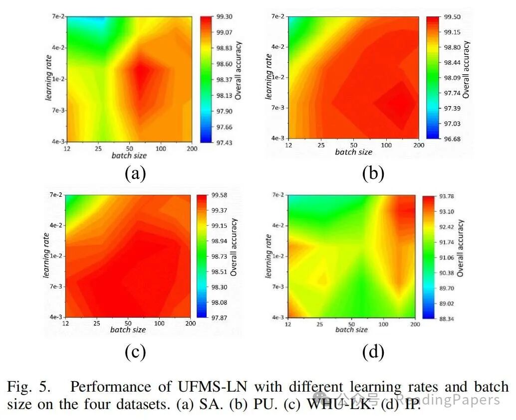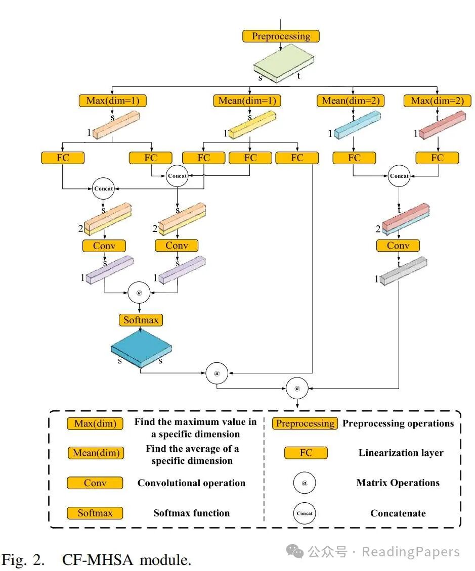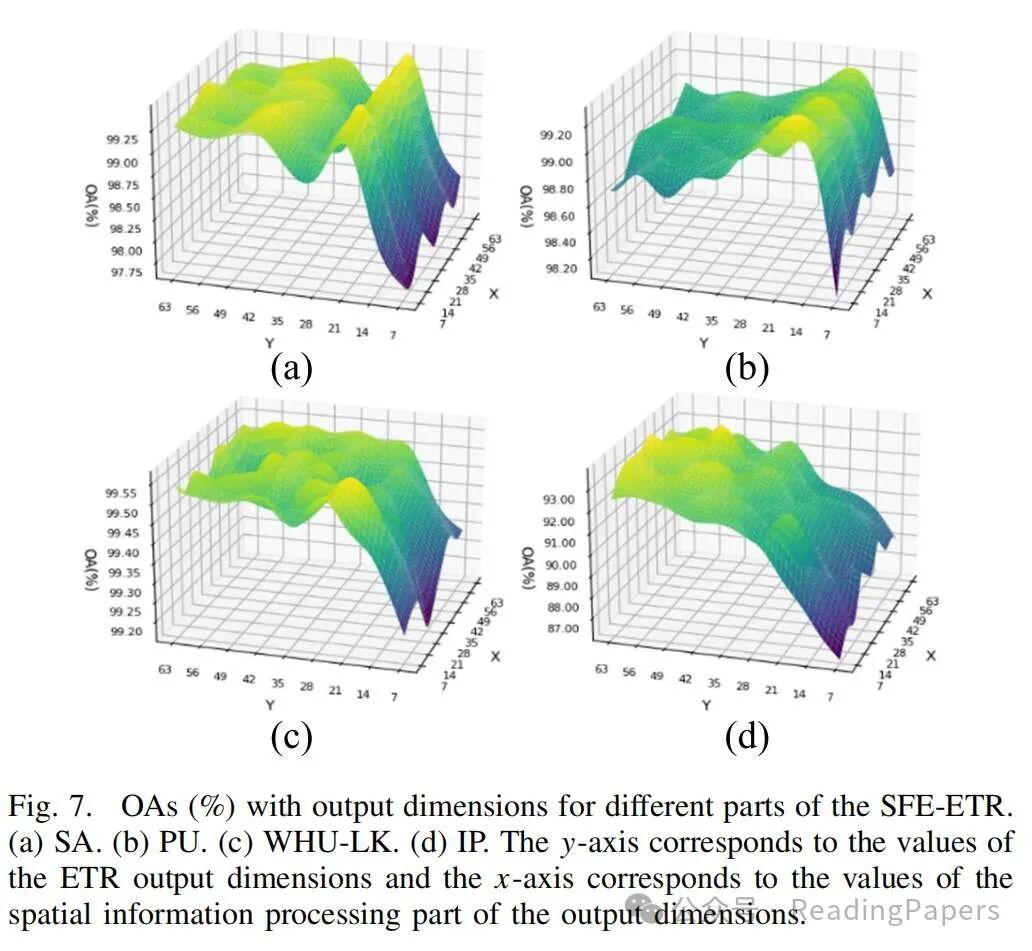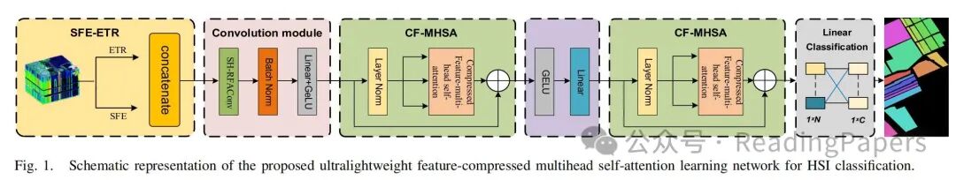 ETR[43]是一种新的预处理方法,它通过将主要特征信息转移到另一个子空间来降低输入数据的维度,增强变换并使数据更平滑。然而,ETR 缺乏提取空间特征的能力,面临降维后显著丢失空间特征的挑战。因此,我们通过结合具有总结能力的空间信息方法,有效地提取空间特征,命名为 SFE-ETR。SFE-ETR 结构是一个双分支处理结构,分别扮演降维、分布增强和空间特征增强的角色。ETR 可以分为两个步骤:降维和增强变换。在第一步中,我们采用主要输入数据集 ,其中 b 代表像素数量,q 代表带数。协方差矩阵根据每个变量的均值计算距离值,从而增强输入特征之间的变化,如下式所示:其中 是 X 的均值; 是增强协方差矩阵,; 是属于范围 的微小值。它们是根据像素之间的相关性从皮尔逊相关系数计算出来的。简单来说,如果相关系数高, 的值就大,反之亦然。linalgeig 是指线性特征分解,用于计算特征矩阵 。接下来,我们从 中取出前 k 维的向量权重矩阵 。最后,通过将 W 与 X 相乘,获得映射到新子空间的最终新子空间维度,提取主要输入数据集的特征。值得注意的是,k 通常小于 q 以实现降维,如下所示:其中 是 X 被映射到新子空间的数据。下一步是增强变换。这部分产生形态学重建方法(MRM)的输出。MRM 主要由形态学膨胀和侵蚀重建组成,本研究采用形态学膨胀方法。形态学膨胀操作(MDO)依赖于两个图像(数据集),掩码(S)和标记(R)图像,它们必须具有相同的大小。前一部分的输出作为掩码图像。这部分的主要挑战在于获取标记图像。此外,在 MDO 中,标记图像的值必须小于或等于掩码图像的值,即 。设 为第二部分的初级输入数据,其中 b 代表实例数量,k 代表特征(带)数量。本研究通过使用该部分中每个实例的平均值或最大值来增强类别内的变化。因此,在创建 R 图像之前存在两种状态:其中 R 是创建的标记图像, 是用于缩放 R 图像中值的常数值。由于选择了 MDO,需要 。计算 S 中每一列的平均值,得到 。然后,我们重复向量 M k 次,将一维向量 (M) 转换为二维矩阵 R 。获得标记图像后,使用 MDO 获得传输图像的过程定义如下: