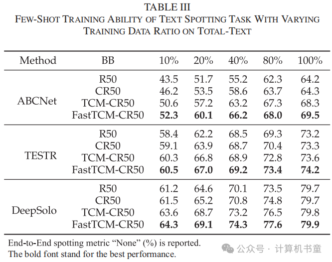 文本识别的少样本实验 此外,我们在Total-Text上使用ABCNet、TESTR和DeepSolo进行了文本识别任务的少样本实验,如表III所示。考虑到文本识别方法中的识别器模块通常难以用非常有限的数据进行有效学习,我们遵循文本识别预训练步骤以获得相应文本识别方法的合适初始化。随后,我们应用Total-Text数据集的不同训练比例来评估少样本学习能力。结果表明,与DB-R50和DB-CR50相比,TCM-CR50和FastTCM-CR50在文本识别任务上展现出了优势。而且,使用我们的方法比基线方法平均提高了4.7%。这证明了FastTCM-CR50在文本识别任务的少样本学习场景中的有效性和优越性,从而扩大了我们方法在现实场景中的适用性和实用性。