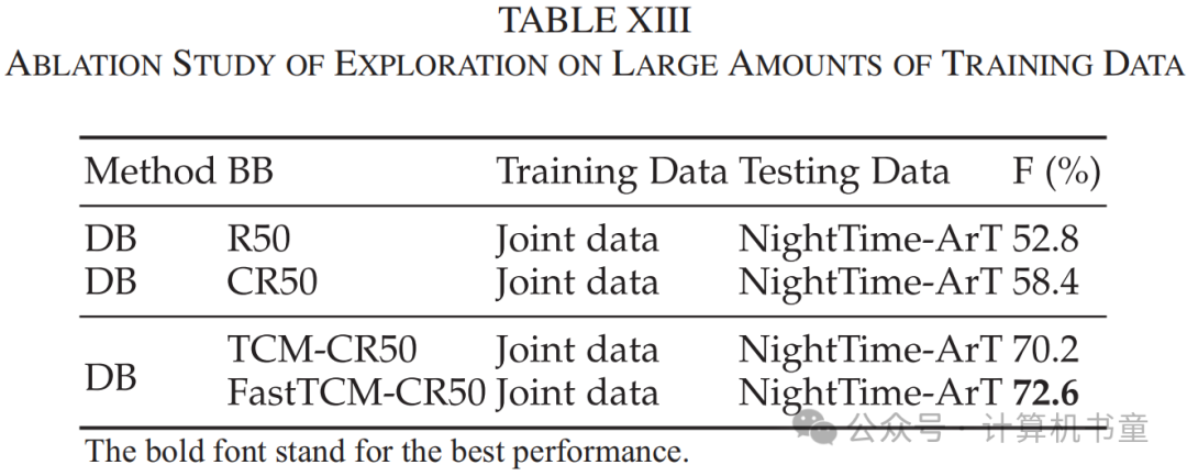 对于不同数据量的消融研究:为了进一步探索FastTCM是否可以学习从增加数据中难以获得的额外知识,我们在包括IC13、IC15、TD、CTW、TT和MLT17在内的大规模公共联合数据上训练了模型,总共有13,784张图像,并在仔细收集的NightTime-ArT数据(326张图像)上进行了测试。ArT的夜间示例在附录中提供,可在线获取。结果如表XIII所示。结果表明,即使增加了大量训练数据,现有方法在明显不同于训练集的夜间数据上仍然存在局限性。然而,集成FastTCM-CR50仍然可以在这种情况下表现出色,表明其强大的泛化能力。