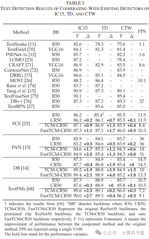 F. 泛化能力 CLIP骨干泛化能力 我们进行了一个实验,以研究通过直接将DBNet的骨干替换为CLIP骨干(CR50)来研究DBNet的泛化性能,如表IV所示。它表明CLIP-R50确实可以为泛化带来好处。然而,通过与FastTCM-CR50骨干结合,性能可以显著提高。这表明直接使用预训练的CLIP-R50不足以提高现有文本检测器的泛化性能,这进一步表明检测器与CLIP之间的协同交互很重要。同时,FastTCM-CR50也持续展现出比TCM-CR50平均高出0.4%的性能提升,进一步强调了我们方法的显著泛化能力。