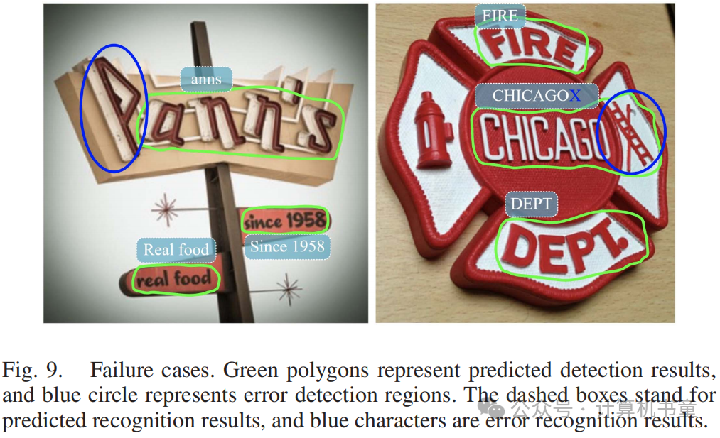 J. 实验总结 FastTCM-CR50在场景文本检测和识别方面的广泛实验分析表明了几个优点:(1) FastTCM可以无缝集成以增强现有的场景文本检测器和识别器,具有高效率。(2) FastTCM显著提高了检测器和识别器的少样本训练能力。(3) FastTCM还展示了强大的泛化能力,适用于包括领域适应、NightTime-ArT数据集和旋转目标检测数据集DOTA-v1.0在内的泛化任务。从ICDAR2019-ArT的NightTime-ArT子集和旋转目标检测数据集(DOTA-v1.0)上的显著改进进一步突出了提出方法的潜力。一些失败案例可以在图9中可视化。我们可以看到,一些类似文本的物体可能被错误地视为正文本区域。
