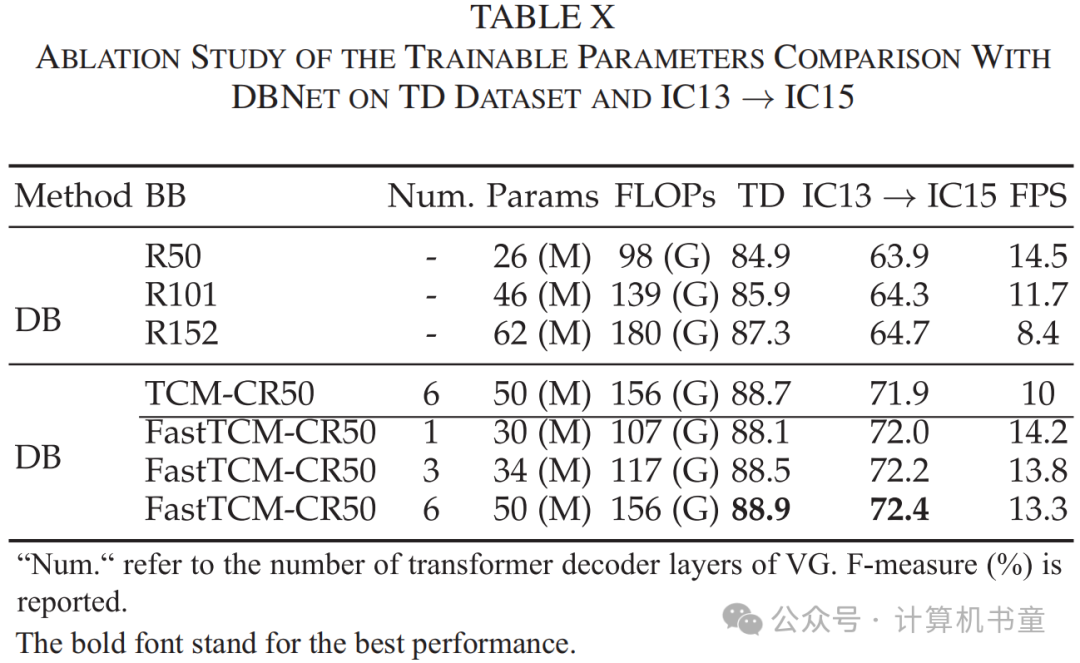 对于参数比较的消融研究:为了公平比较,我们通过将骨干替换为更大的ResNet来增加DBNet的参数,然后在TD数据集和IC13 → IC15领域适应实验中进行文本检测实验。使用输入尺寸1280 × 800计算的可训练参数和FLOPs。结果如表X所示。结果表明,与R152骨干的DBNet相比,DBNet与FastTCM-CR50具有更好的性能,并且模型尺寸和计算开销较小,证明了其有效性。