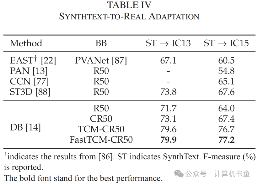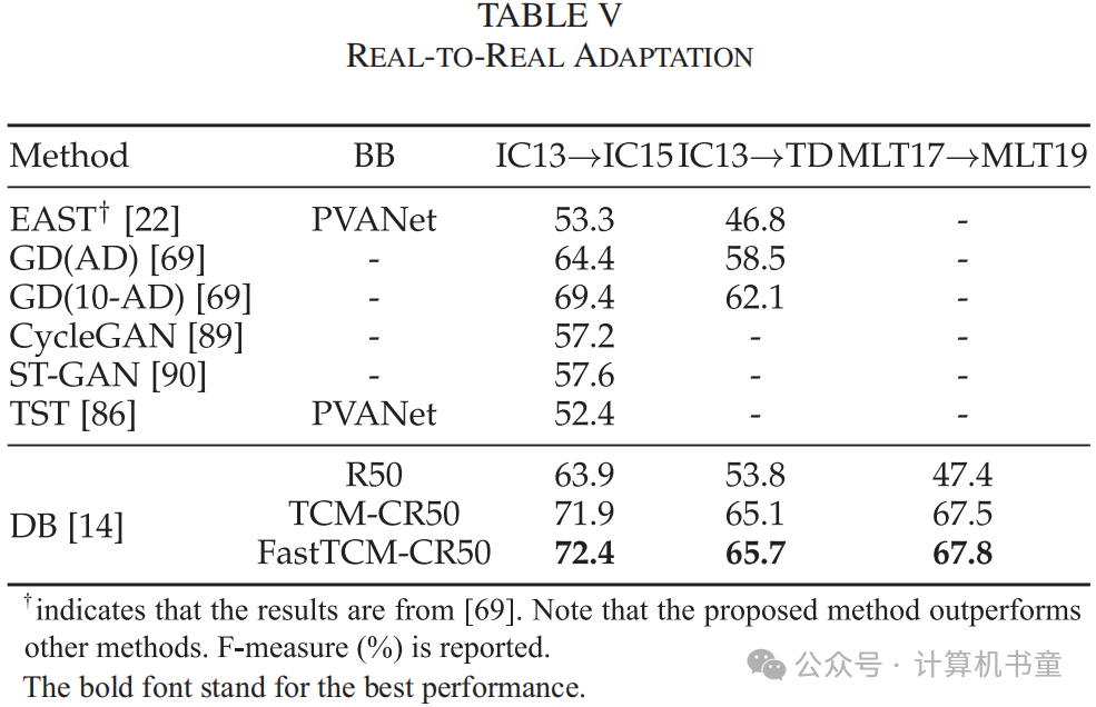 Synth-to-real和real-to-real适应性 我们在文本检测任务上进行了两种类型的实验,包括synthtext-to-real适应性和real-to-real适应性,如表IV和V所示。Real-to-real适应性包括单语言和多语言场景。从表格中我们可以看到,通过将FastTCM-CR50集成到DBNet中,我们在四种不同的设置中显著提高了性能,平均提高了12.4%的F-measure,这进一步证明了我们方法的有效性。值得注意的是,FastTCM-CR50也持续展现出比TCM-CR50平均高出0.4%的性能提升,进一步强调了我们方法的显著泛化能力。