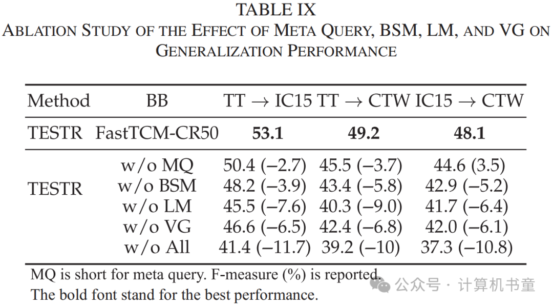 对于可学习提示的消融研究:然后,结合预定义提示和可学习提示的结果在表VIII的第三行中提供。我们注意到通过添加可学习提示可以持续提高性能。我们还展示了使用不同数量的可学习提示在表VIII的第4到第6行中的影响。我们观察到,随着可学习提示数量的增加,所有数据集的性能逐渐提高。与值4相比,值32在CTW、TD和TT上获得了明显的改进。我们推测这是因为更多的可学习提示可以更好地引导预训练文本编码器的知识,这对文本检测很有用。在以下实验中,默认的可学习提示数量设置为4以简化。 对于语言提示模块的消融研究:此外,我们评估了提出的语言提示模块的性能,如表VIII第7行所示。借助语言提示模块的帮助,我们发现TCM在所有四个数据集上都取得了进一步的改进,特别是在ICDAR2015上,表明为每张图像生成的条件提示cc可以确保在不同类型的数据集上更好的泛化。 对于视觉提示生成器的消融研究:此外,结合提出的其他组件,视觉提示生成器在所有四个数据集上的F-measure改进比基线更好,IC15和TD上的边际分别提高了1.7%和2.0%。这种明显的补充现象的原因是视觉提示生成器可以从文本特征向视觉特征传播细粒度的视觉语义信息。此外,由视觉提示生成器生成的提示局部图像嵌入可以指导模型获得更准确的文本实例级视觉表示,这增强了实例-语言匹配的能力,并生成了对下游检测头部有用的精确分割分数图。 对于双模态相似性匹配的消融研究:我们进一步比较了使用和不使用双模态相似性匹配的结果,如表VIII BSL+组的第7行所示。结果清楚地表明,利用双模态相似性匹配可以带来更高的性能。这一发现表明,双模态相似性匹配在训练模型中起着至关重要的作用,通过动态丰富文本嵌入与视觉信息,从而提高整体性能。 对于辅助损失的消融研究:我们比较了使用和不使用辅助损失的结果,如表VIII BSL+组的最后一行所示。我们观察到使用辅助损失可以获得更高的性能。结果表明辅助损失有助于通过在实例-语言匹配分数图上施加约束来训练模型。此外,性能的提高表明它可能有助于预训练的CLIP图像编码器有效地感知局部文本区域。 对于关键组件对泛化性能影响的消融研究:如表IX所示,从FastTCM中移除元查询和BSM组件会大幅恶化泛化性能,突出了这些组件的重要性和有效性。同样,移除VG和LM组件也会导致泛化性能的大幅下降,进一步验证了它们的效果。最后,当我们移除所有这些组件时,性能会额外显著下降,表明每个组件都为FastTCM-CR50的整体有效性和性能做出了贡献。