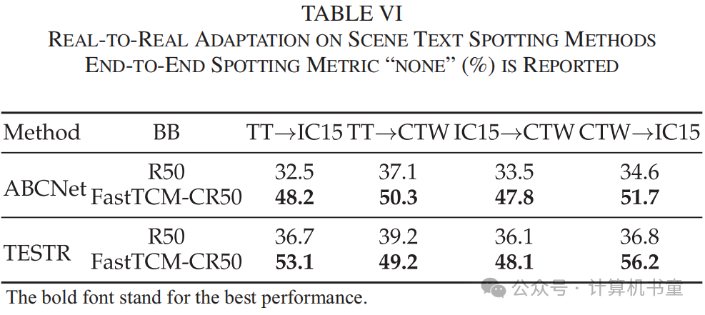 场景文本识别的real-to-real适应性 此外,我们还对现有的识别方法进行了real-to-real适应性实验,如表VI所示。结果表明,FastTCM-CR50能够通过平均提高14.8%的性能来增强现有的场景文本识别方法,这进一步展示了有效的泛化能力。