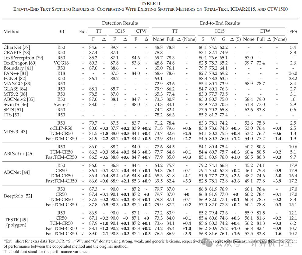 D. 与现有识别器方法的合作 检测结果 如表II所示,我们注意到当TCM-CR50与五种不同的文本识别方法结合时,在文本识别基准测试中的F-measure上持续提升。特别是,TCM-CR50在TT数据集上比基线方法MTSv3、ABINet++、ABCNet、DeepSolo和TESTR高出0.2%至1.8%的F-measure性能提升。在IC15和CTW数据集上也观察到一致的性能提升,强调了TCM-CR50适用于文本识别方法。此外,当FastTCM-CR50与MTSv3、ABINet++、ABCNet、DeepSolo和TESTR结合时,我们观察到比基于TCM-CR50的方法平均提高了0.2%的性能,伴随着类似的速度提升,表明FastTCM-CR50的优越性。此外,包括更大规模的数据集TextOCR,如TT数据集上的TESTR,实现了0.9%的性能提升。