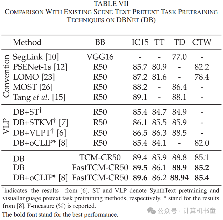G. 与预训练方法的比较 基于特定设计的预文本任务的预训练方法在文本检测领域取得了有效的进展。与这些努力相比,FastTCM-CR50能够直接将CLIP模型转化为场景文本检测器,无需预训练任务。比较结果如表VII所示,从中我们可以看到,无需预训练任务,DB+FastTCM-CR50在所有基准测试中一致优于以前的方法,包括DB+STKM、DB+VLPT和DB+oCLIP。特别是在IC15上,我们的方法以89.5%对86.5%的F-measure大幅超越了以前的最先进预训练方法。此外,我们还展示了提出的骨干可以进一步通过如oCLIP中的预训练任务进行改进,平均提高了0.11%的F-measure。