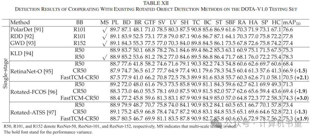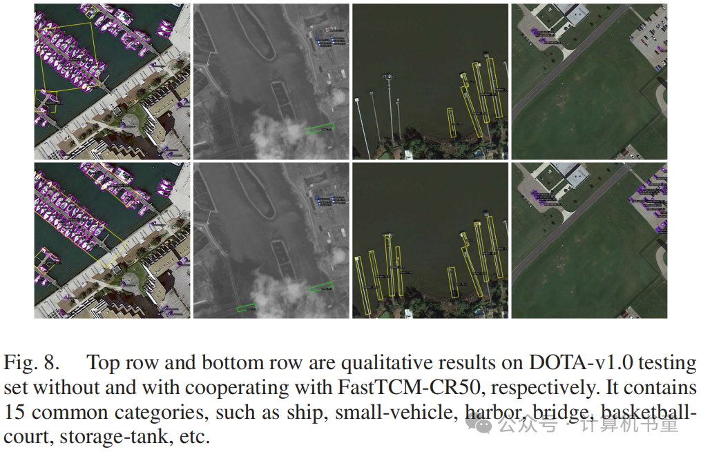 I. 旋转目标检测 为了进一步验证我们方法的泛化能力,我们将其适应于定向目标检测,并在广泛使用的DOTA-v1.0数据集上评估其性能,该数据集专门设计用于航空图像中的定向目标检测。DOTA-v1.0数据集包含15个常见类别、2806张图像和188,282个实例。在训练期间,我们采用了与合作方法相同的配置。如表XII所示,我们将我们的模型与以前的定向目标检测方法结合起来。结果表明,使用提出的FastTCM-CR50骨干可以持续改进。我们猜测FastTCM-CR50的改进源于其利用CLIP提供的丰富先验知识,从而优化了卫星图像中特定类别的识别和定位。具体来说,FastTCM-CR50在视觉特征和它们的文本描述之间启动了协同作用。与文本描述对齐的视觉特征被放大,使视觉特征更多地关注与遥感类别相关的部分,从而增强了旋转目标检测的性能。DOTA-v1.0上的定性结果如图8所示。