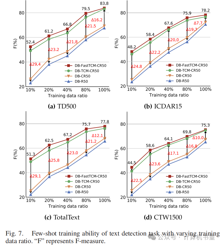 端到端识别结果 在表II中,我们展示了我们的方法与现有场景文本识别器结合时的端到端识别性能。TCM-CR50在与各种合作方法结合时展现出了有利的性能。具体来说,在IC15数据集上,带有强词典的端到端设置中,TCM-CR50比原始的MTSv3、ABINet++、ABCNet、DeepSolo和TESTR分别高出+0.8%、+0.3%、+2.3%、+0.1%和+0.4%的'S'指标性能。在TT和CTW数据集上也观察到类似的一致性能提升,表明TCM-CR50有效地增强了现有的场景文本检测器和识别器的性能。此外,当用FastTCM-CF50替代TCM-CR50时,我们观察到比基线方法平均提高了1.5%的性能,比TCM-CR50平均提高了0.55%的性能,并且推理速度提高了约46.4%。这些结果突出了FastTCM-CR50的优越性及其在高效和准确的文本识别任务中的潜力。此外,当使用额外的大规模TextOCR作为训练数据时,我们的模型可以实现进一步的性能提升,这表明我们方法与大规模数据集的兼容性。 E. 少样本训练能力 文本检测任务的结果 为了验证我们方法在文本检测任务上的少样本训练能力,我们直接在真实数据集上使用不同比例的训练数据进行训练,并在相应的4个基准测试上进行评估。如图7所示,DB-FastTCM-CR50在有限数据上显示出了鲁棒性,并在平均10%的训练数据比例设置下比基线方法DB平均提高了26.5%的F-measure性能。此外,DB-CR50与我们特定的设计FastTCM相比改进有限。结果表明,FastTCM可以通过利用零样本训练的CLIP模型的预训练视觉和语言知识来捕获文本的固有特征。