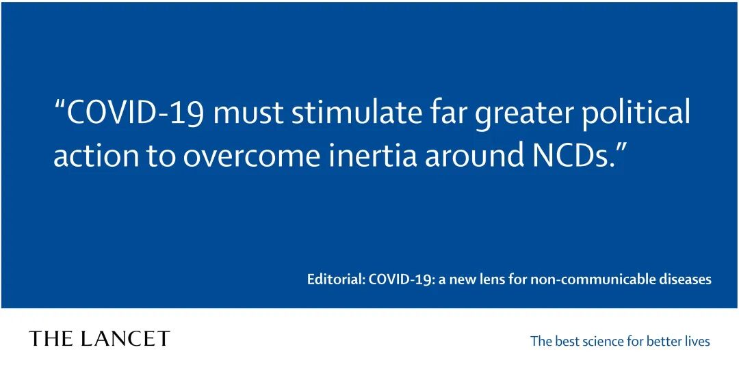 《柳叶刀》(The Lancet)发表的一篇社论强调:“COVID-19和非传染性疾病之间形成了一种危险的关系,它们共同加剧了社会和经济不平等……COVID-19大流行突出了非传染性疾病对卫生资源造成的沉重负担。COVID-19应该成为政府实施更严格的烟草、酒精和糖类控制,以及明确投资来改善体育活动和健康饮食的催化剂。COVID-19已经表明,许多抗击大流行所需的工具也正是与非传染性疾病作斗争所需的工具:包括疾病监测、强大的民间社会组织、强大的公共卫生体系、明晰的沟通以及公平地获得弹性全民医疗保健系统(resilient universal health-care systems)……COVID-19必须刺激更多的政治行动,以克服在非传染性疾病方面的不作为。”