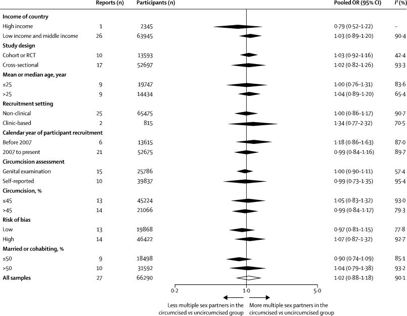 图3.异性恋男性包皮环切与多个性伴之间关联的亚组分析