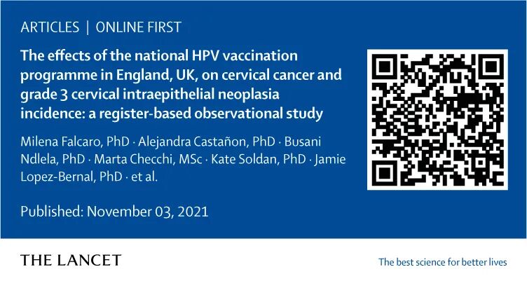 《柳叶刀》(The Lancet)近日发表的一项新研究证实,在12-13岁时接受人乳头瘤病毒(HPV)疫苗接种的女性中,宫颈癌发病率比前几代人降低了87%。作者指出,希望这些新结果能够鼓励人们接种疫苗,因为疫苗接种计划的成功不仅取决于疫苗的功效,还取决于接种人群的比例。识别文中二维码或点击文末“阅读原文”,查看论文原文。