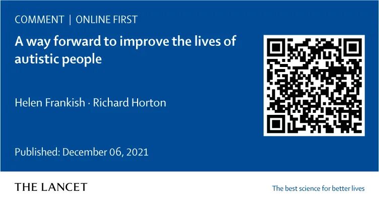 《柳叶刀》系列期刊总编Dr Richard Horton和《柳叶刀》执行主编Helen Frankish在该报告的评论中写道:“该重大报告的建议强调,应当在自闭症患者的整个生命期和发展阶段中寻求更加明确的需求信息、优势和最有效的服务手段,以改善所有自闭症患者及其家庭的生活质量。该重大报告所传递的信息就是一个希望。研究表明,为改善自闭症患者的生活状况,可以做很多事情。但是采取协调一致的行动刻不容缓,以回答有关自闭症患者照护的基本问题,同时制定政策和方案,改善全球所有自闭症患者的生活。”END