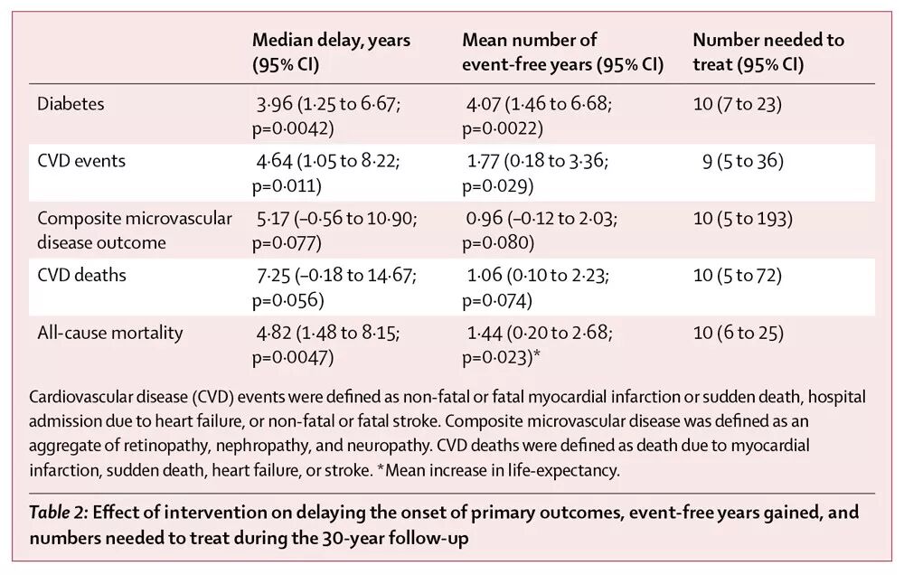 另外,生活方式干预使得糖耐量受损人群的糖尿病发病推迟4年,心血管事件发生推迟4.64年,微血管病变推迟5.17年,心血管死亡推迟7.25年,全因死亡推迟4.82年,平均预期寿命提高1.44年。(如下表所示)