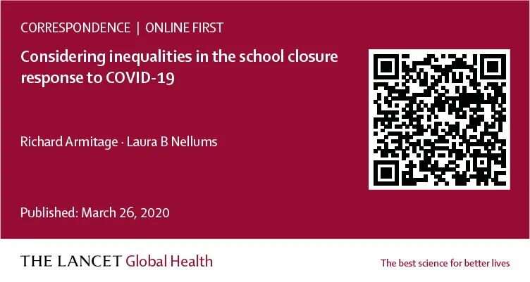 在《柳叶刀-全球健康》(The Lancet Global Health)发表的一篇通讯中,Richard Armitage和Laura Nellums质疑是否存在充分的证据支持关闭学校可降低病毒传播,并考量了社会、经济和健康不平等的加剧给儿童带来的长期风险。联合国2015年发布的一份报告分析了埃博拉疫情给非洲造成的社会经济影响,同时也着重指出疫情中年轻女孩怀孕、辍学及虐待儿童等事件发生的风险增加。
