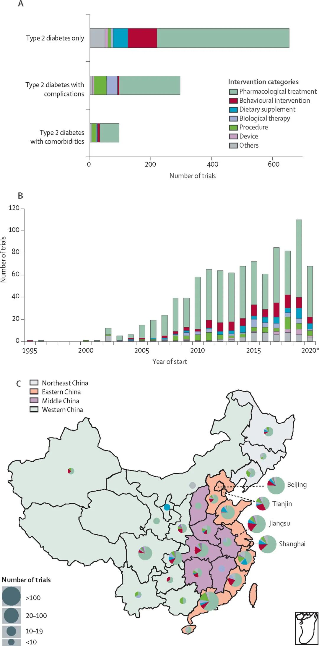 图:显示按患者和干预类别划分的中国大陆2型糖尿病临床试验数量