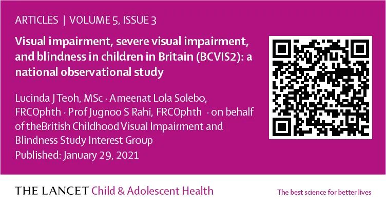 作为准确收集年龄分层数据的一环,Lucinda Teoh等人于1月29日发表了《英国儿童视觉障碍和失明研究2》,报告了英国儿童视觉障碍全疾病谱发病率。作者将视觉障碍定义为视力不高于0.5 logMAR,发现18岁以下年轻人视觉损伤的累计发生率为10/10000。半数病例发生在出生后第一年内,大部分是由脑性视觉障碍、视网膜疾病或视神经疾病引起的,且具有少数族裔背景、社会经济地位较低、或早产儿童的发病率更高。该研究提供了首份国家级代表性数据,其他国家也需要进行同样的研究,特别是在低收入地区(85%的视觉障碍者生活在低收入地区)和亚洲等高疾病负担地区。