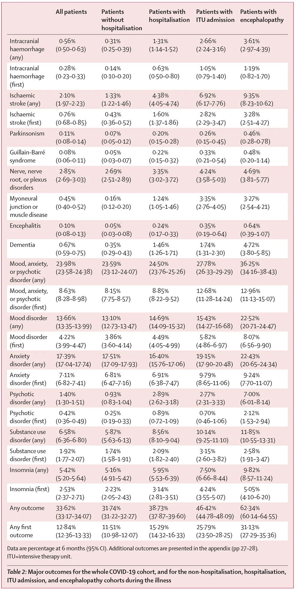 感染新冠后最常见的诊断是焦虑症(17%的患者出现)、心境障碍(14%)、物质滥用障碍(7%)和失眠(5%)。神经系统疾病的发病率较低,其中脑出血为0.6%,缺血性中风为2.1%,痴呆为0.7%(见表2)。