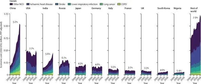 图2:2000-2016年不同国家及地区PM2.5导致不同病因死亡的健康经济损失