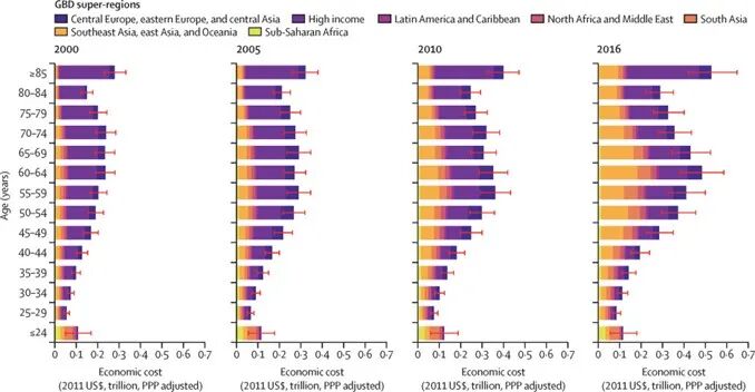 图1:2000、2005、2010及2016年不同GBD(Global Burden of Disease)超级地区、各年龄层的健康经济损失分布