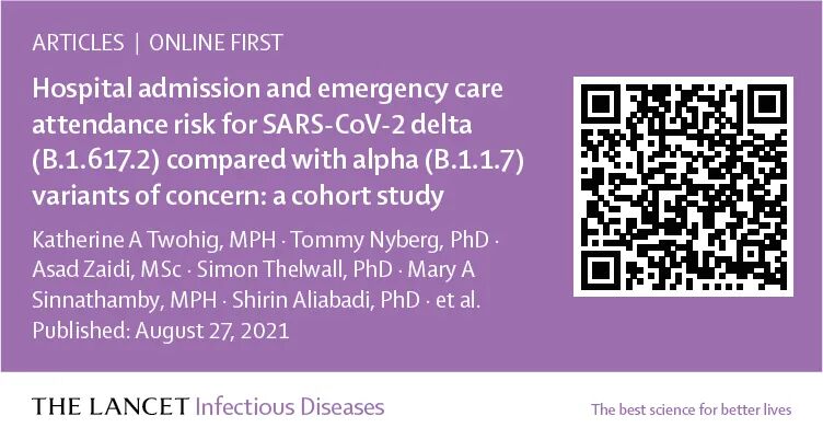 《柳叶刀-感染病学》(The Lancet Infectious Diseases)近日发表一项研究显示,相比于SARS-CoV-2阿尔法(Alpha)变异株的感染者,德尔塔(Delta)变异株感染者的住院风险增加约一倍。作者指出,全面接种疫苗对于降低个人感染德尔塔(Delta)变异株的风险至关重要,而且值得注意的是,全面接种疫苗也可以降低感染德尔塔(Delta)变异株的患者罹患重症和入院治疗的风险。识别文中二维码或点击文末“阅读原文”,查看论文原文。