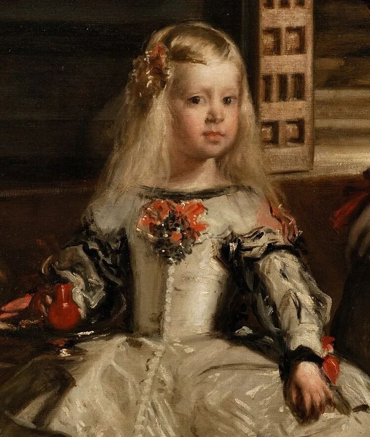 而另一个传闻是评论者们认为更符合委拉斯凯兹宫廷画家身份的:在岁月缓慢流淌的宫廷里,国王想要画家作一幅画来消解冗长的时光,于是他召来他最疼爱的小公主让画家捕捉童真的纯粹,但公主不情愿加入这场游戏,身旁侍女只好百般劝解让公主将这出“玩偶之家”演得久一些。无论玛格丽特公主到底是偶然还是故意进入“画”中,她都必将成为这幅画的主要构成。对于画家而言,宫闱之下又不敢不提君王。故而这幅画便成了来自君主的试探,菲利普四世给委拉斯凯兹出了一道题:如何在以玛格丽特公主为主角的构图下,突出王权的主导地位。如今看来委拉斯凯兹这幅画是一幅满分作答,初见的确是围绕小公主的宫廷图景,仔细推敲,观众却与置于镜中的国王王后视线共享,一同静静观赏被美化过的现场。