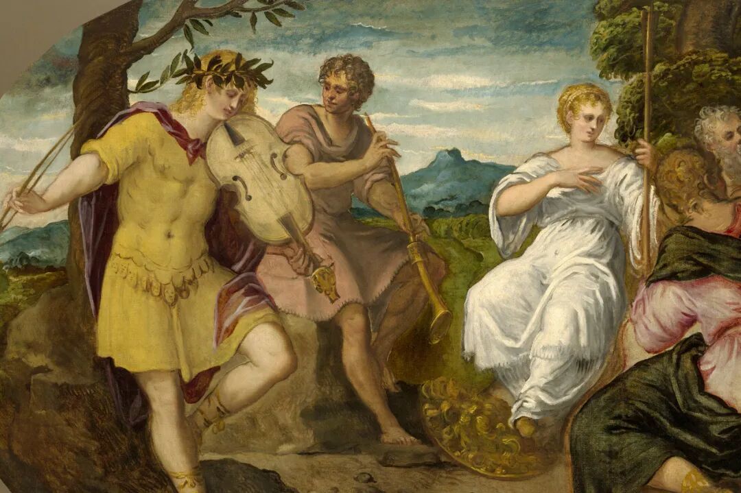 但委拉斯凯兹也不是一位沽名钓誉之辈,镜子照出了他的欲望也暗藏了他的反讽。《宫娥》 里,墙上两幅藏于阴影的画作,后世有“列文虎克”发现一幅描绘的是“密涅瓦惩罚阿拉喀涅” (Minerva Punishing Arachne),另一幅是“阿波罗对马尔斯的胜利”(Apollo’s Victory Over Marsyas)。这两幅画正好对映镜中国王与王后的倒影:王后一边是象征着智慧女神与艺术守护神的密涅瓦,国王一边则是太阳神阿波罗,两个故事都揭示了凡人挑战神的可怕后果,是想说明人之渺小还是歌颂普罗米修斯一般的反叛执着?