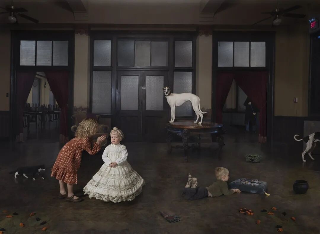 《游乐场》拍摄了孩子们在学校操场上玩耍的照片,灵感来源于摄影师的童年回忆。莫里斯会在放学时间架起相机,捕捉多个画面,再从几个场景合成最终成品,由此他发现了基于社会生活具有启发性的“游戏”摄影叙述。这些照片让人想起了年少时的烦恼,尴尬、轻松、欢乐与焦虑的时刻滴进游戏时间里,在记忆深处闪耀着玫瑰色光芒。莫里斯的图像抓取到了跨越社会阶层与国家界限孩子们游戏的相似之处,同时也察觉到了阶级与特权的深刻分歧,这些分歧往往在孩子们长大成人能理解其含义之前就早已存在。