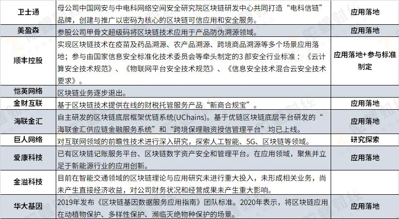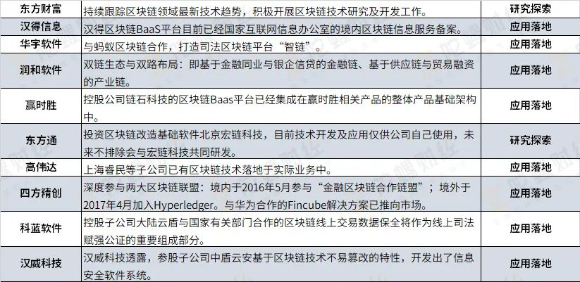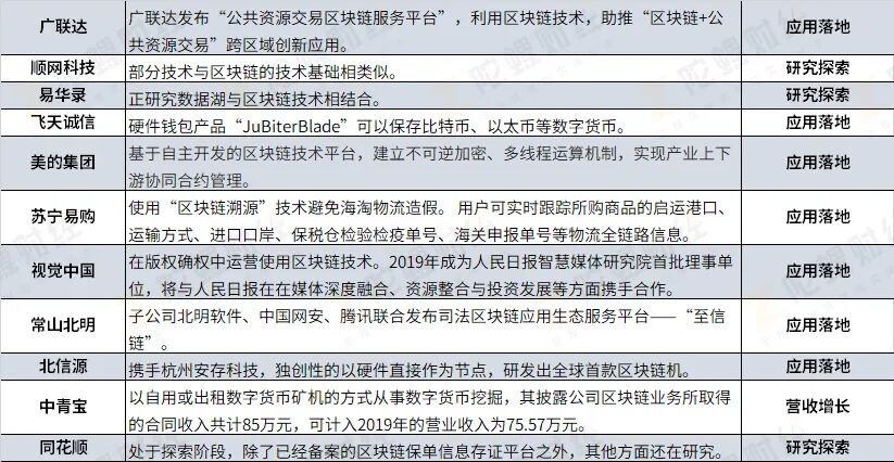 根据各个企业的对外声称内容可以看出,近半数企业的区块链业务依旧停留在研究阶段。如视觉中国、同花顺、东方财富等公司则是仍旧处于区块链研究和探索阶段,尚未有成型的业务。