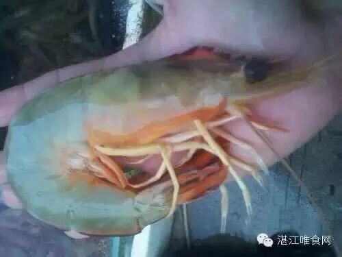 湛江对虾,又名白虾,此虾为天然的,色泽光鲜,头脑绿色为天然,此虾中与小的时候,颜色比较鲜艳,到2两大的时候,后背会有条绿色的膏。
