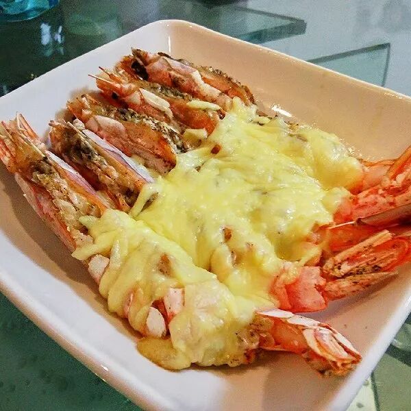 2、烤盘上铺上锡纸,摆上大虾,大虾肉上放上马苏里拉芝士,准备入烤箱。