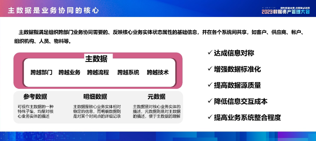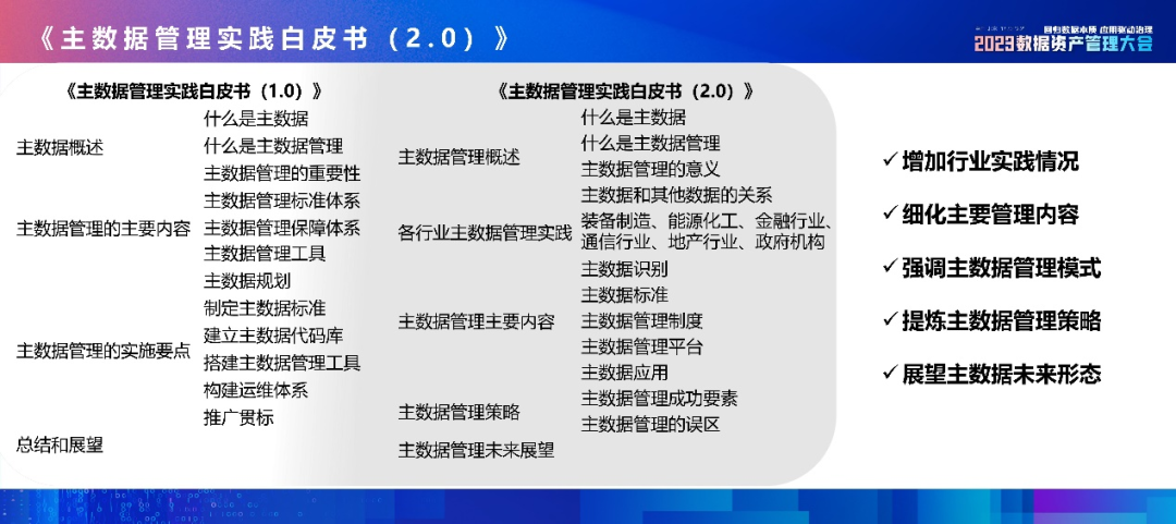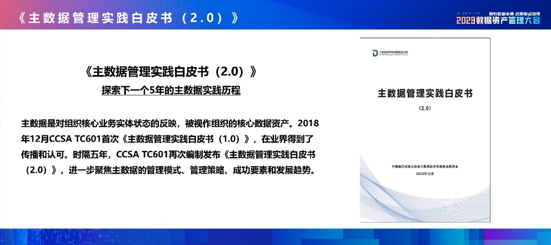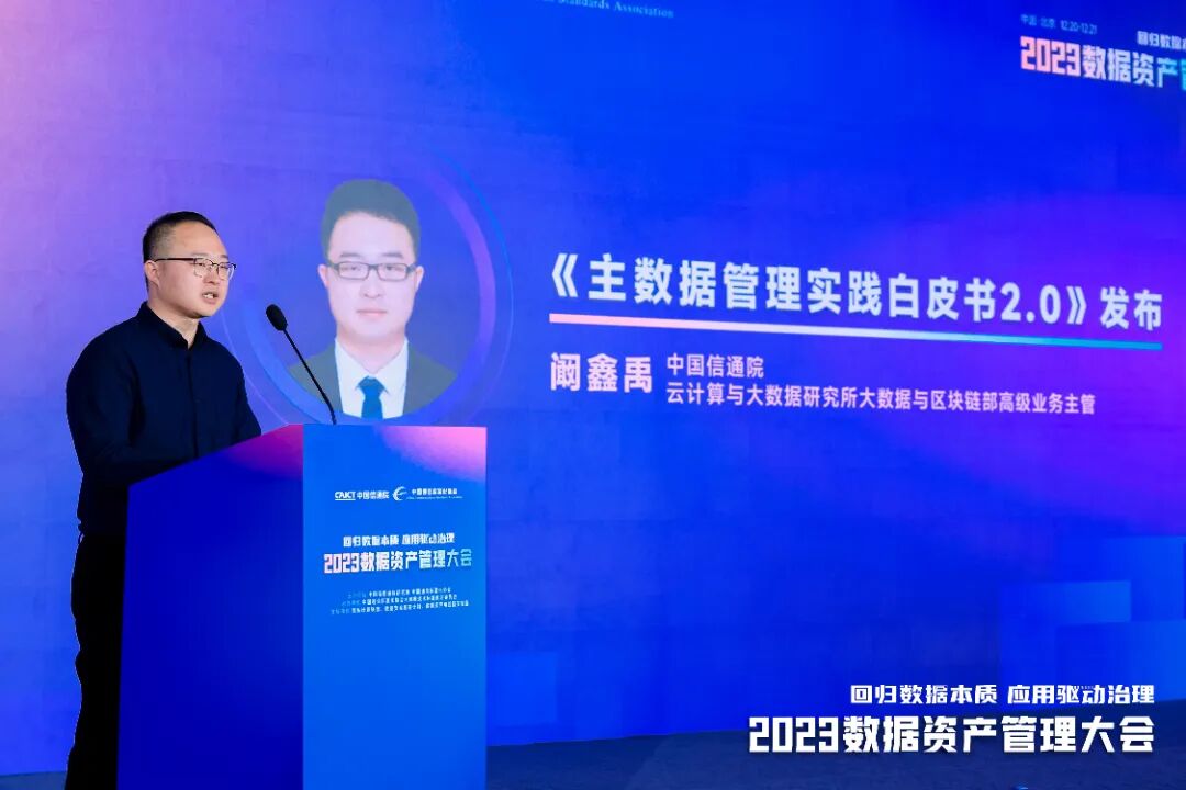 2023年12月20日,在“2023数据资产管理大会”上,《主数据管理实践白皮书(2.0)》正式发布,由中国信息通信研究院云计算与大数据研究所高级业务主管阚鑫禹进行解读。
