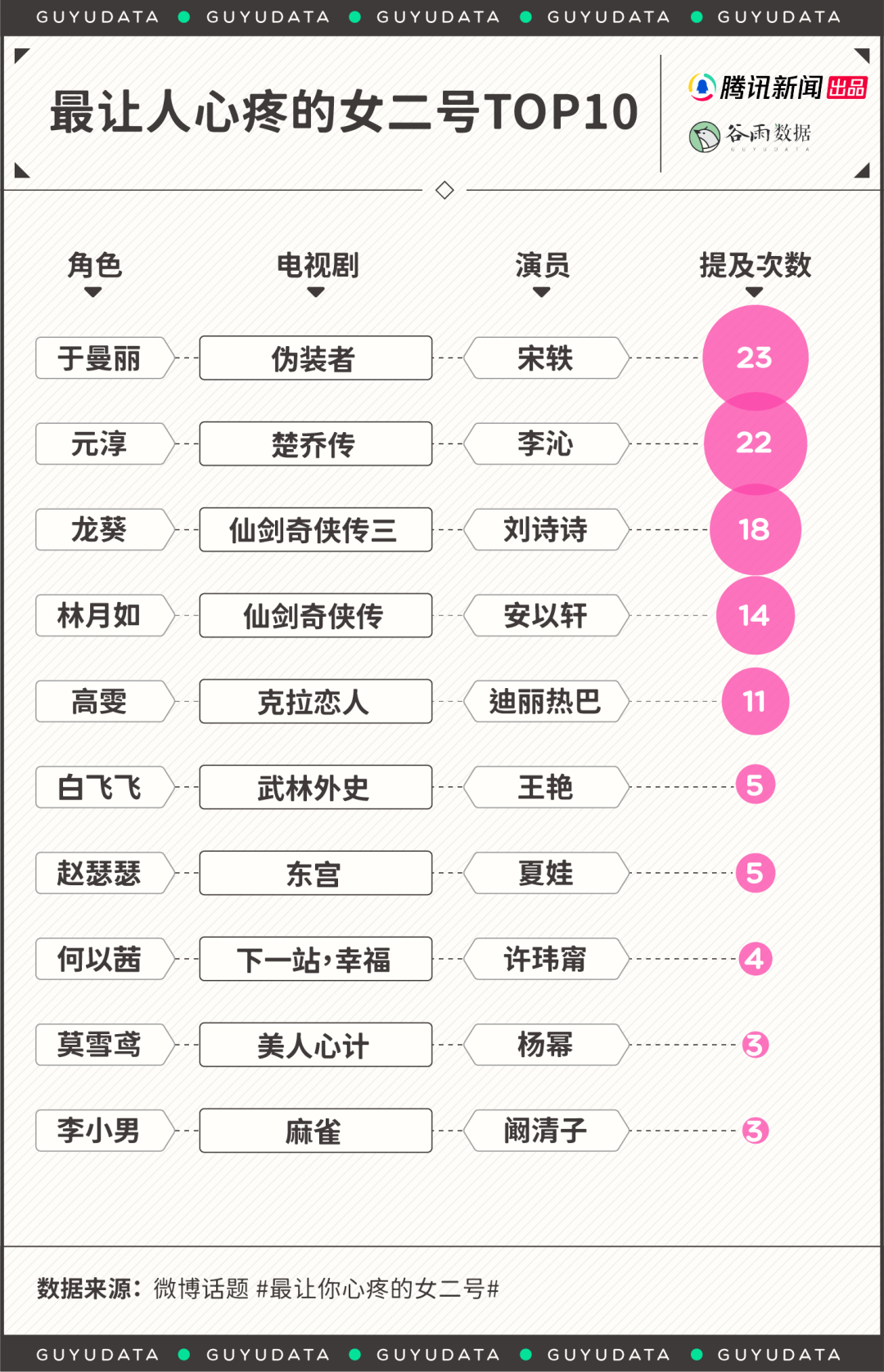 比如“最让你心疼的女二号”话题下网友呼声最高的角色——《伪装者》女二于曼丽,她曾为了报仇成为令人闻风丧胆的“黑寡妇”杀人犯。然而细究她的经历,大多数观众都会为她的凄惨身世而心疼,为她刚烈的性格而折服。