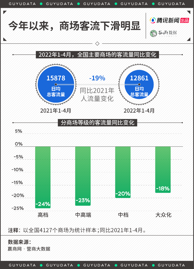 根据赢商网·赢商大数据,今年1-4月,全国购物中心场日均总客流量已降至12861人次,同比去年同期减少19%。