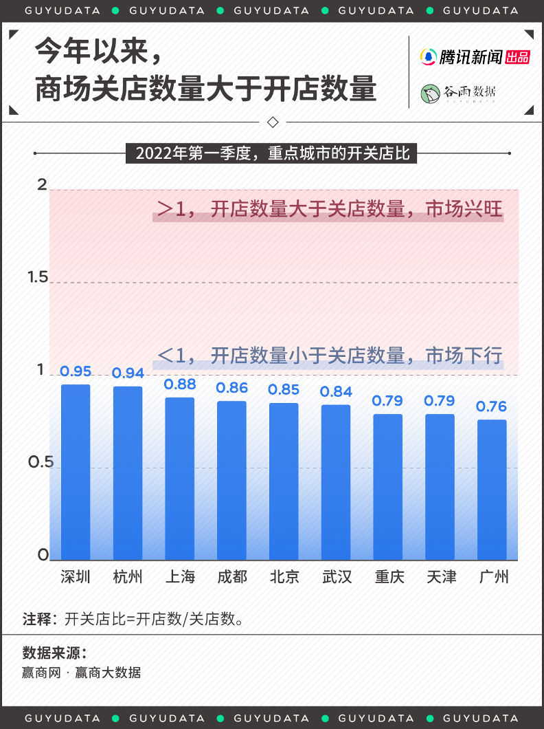 数据显示,2022年第一季度,重点城市商场的开关店情况,总体以关店居多。