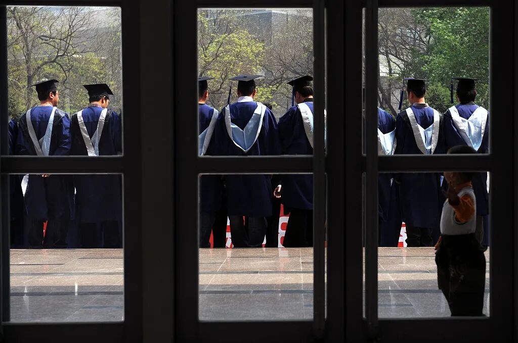 飞机起落一次,白浩就完成一次身份转变的仪式。不过不是所有场合白浩都愿意讲清北生活的美好,衡中曾经邀请他去劝说学弟学妹走提前批录取,他没有同意,因为“太痛了”,他无法回避一个不合适的专业给他的伤害。有时候,白浩会回想起自己当初的选择,如果重新报志愿,白浩可能会选择同样录取他的复旦大学经济系,而不是去读小语种,可惜在当时,他感到“北大是没办法拒绝的”。北京大学百年讲堂前,拍摄毕业照的毕业生 ©视觉中国北大毕业的教培老师周敏也放弃了很多。她感觉自己给小学生讲课就像一场演出,虽然和自己向往的话剧舞台还是有很大差距。