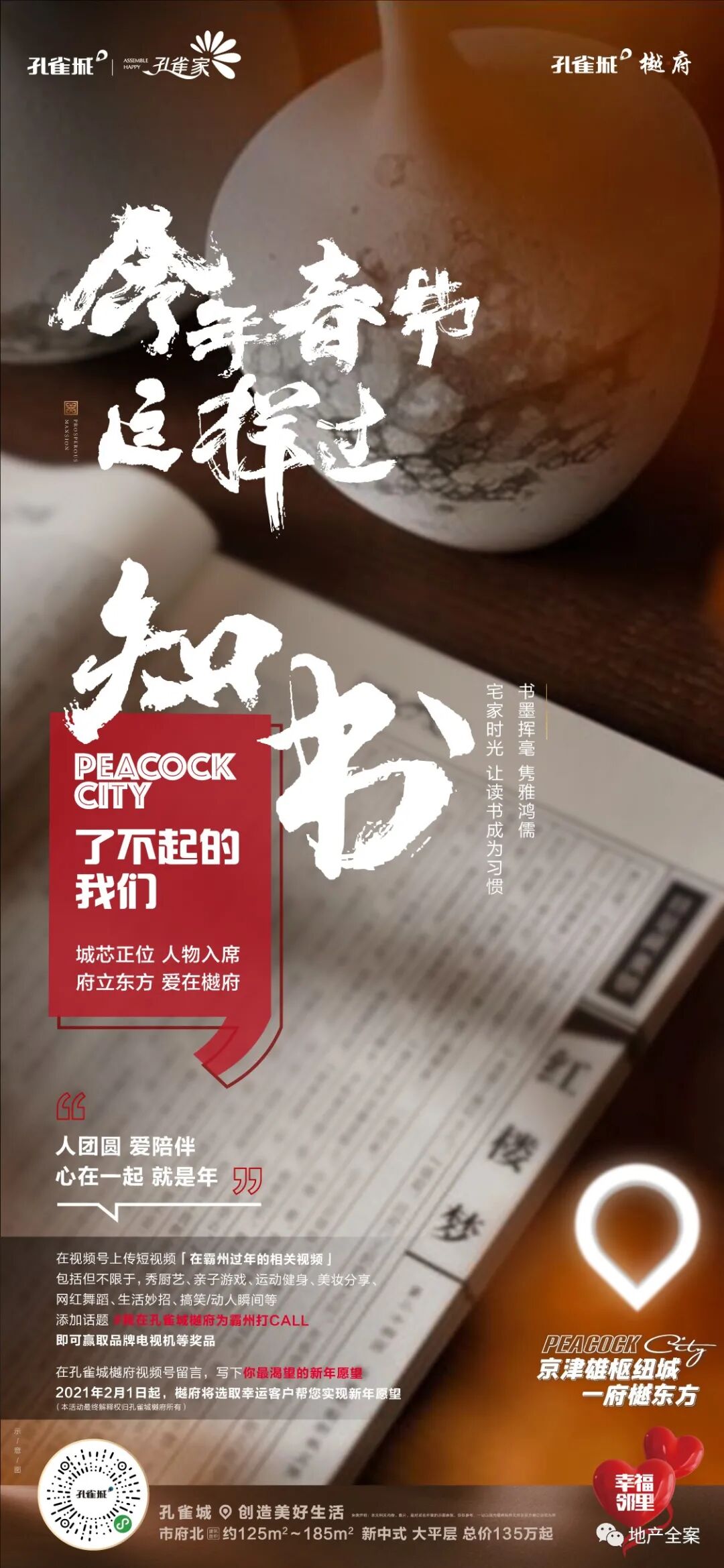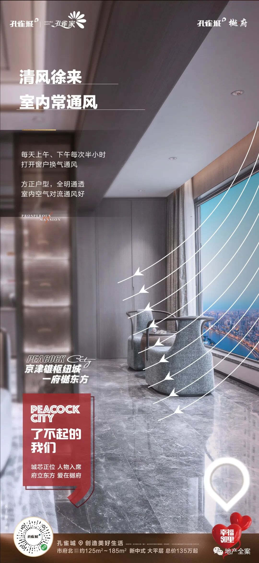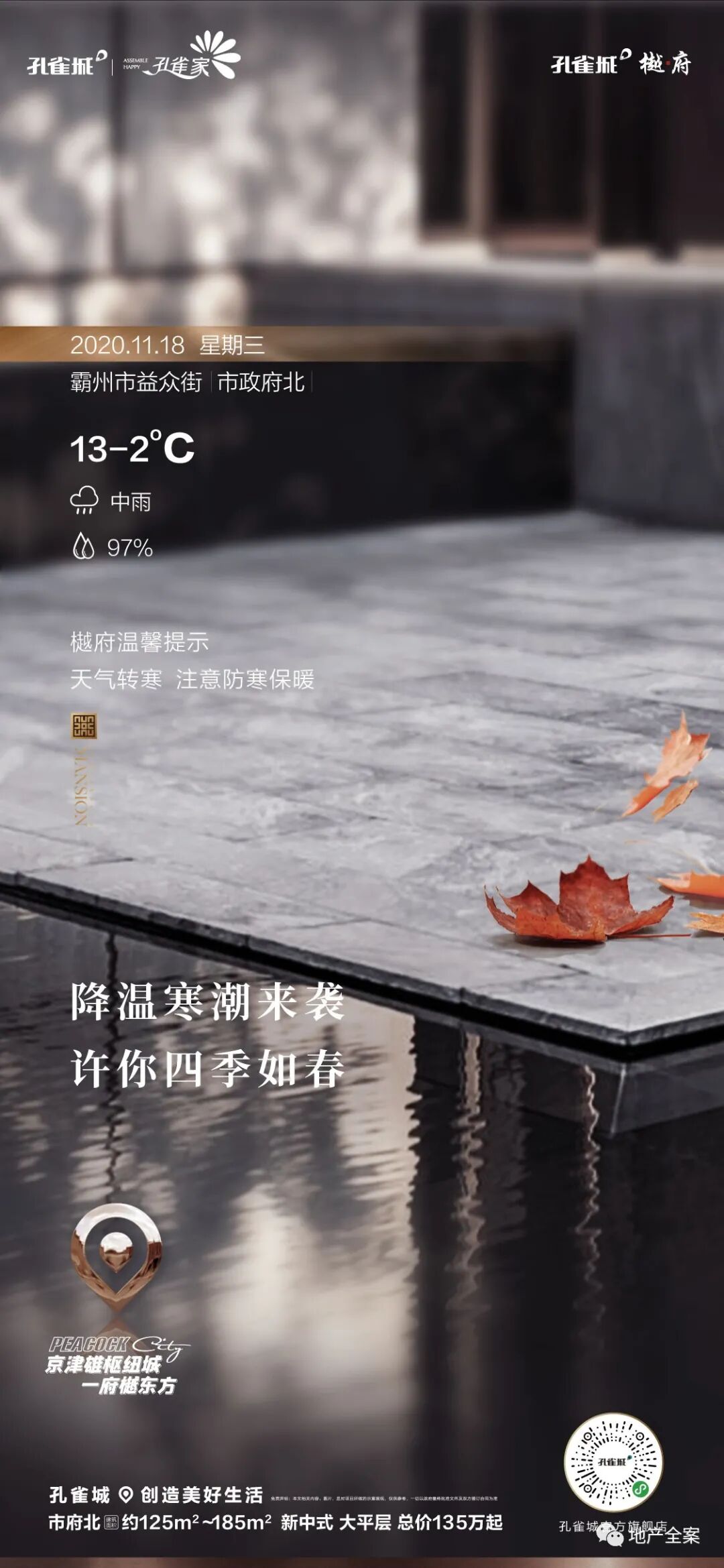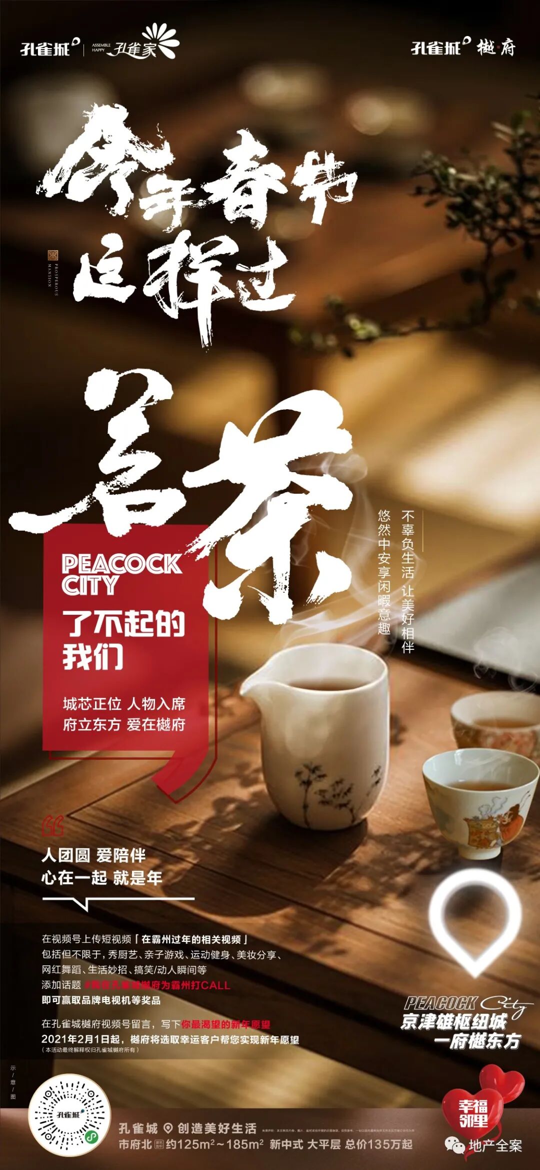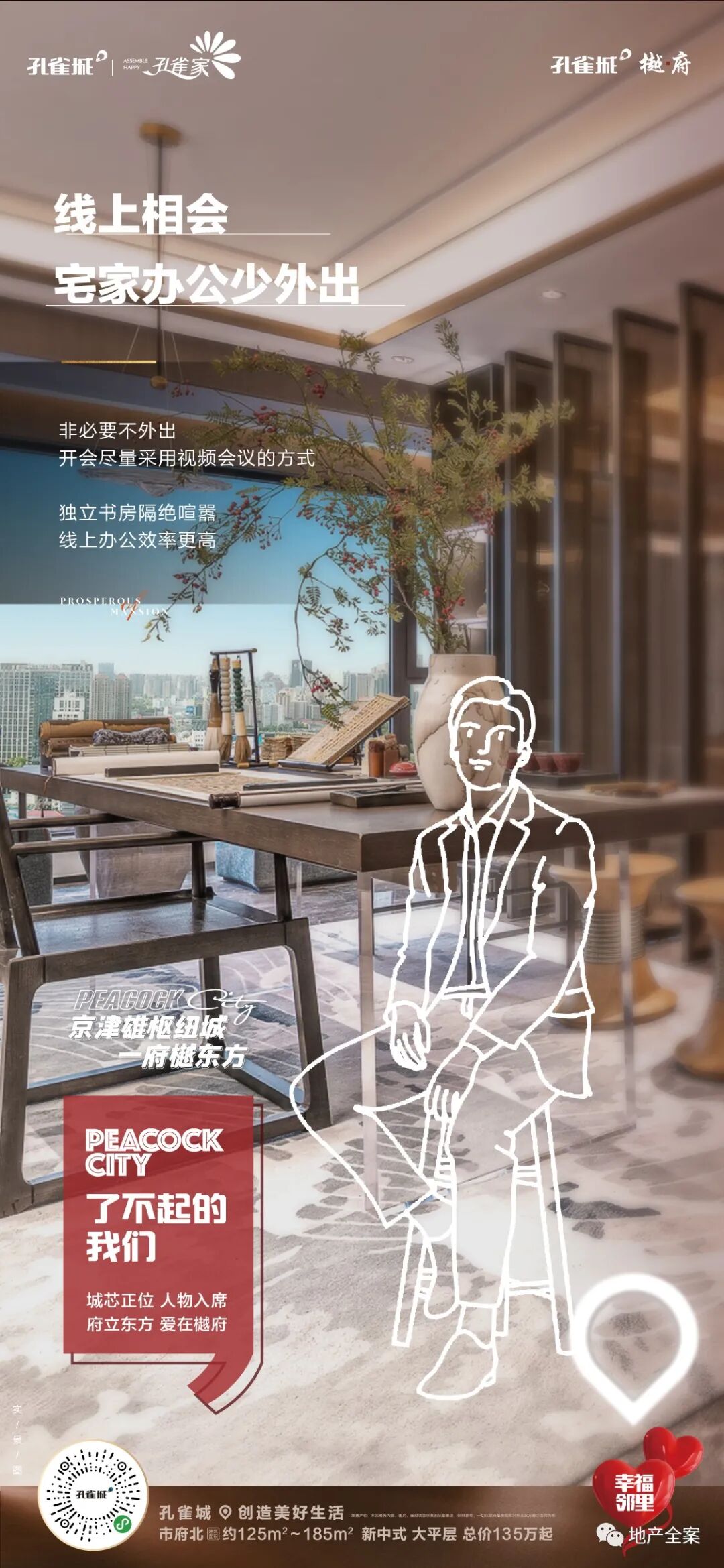 孔雀城樾府,是孔雀城全新的一条产品线,不同于以往的快销快走的刚需盘,它以新中式产品精耕细作,成就了孔雀城樾府系的开山之作。八载霸州深耕,孔雀城于霸州繁华城芯之处,再成当代鸿鹄风雅之谈!