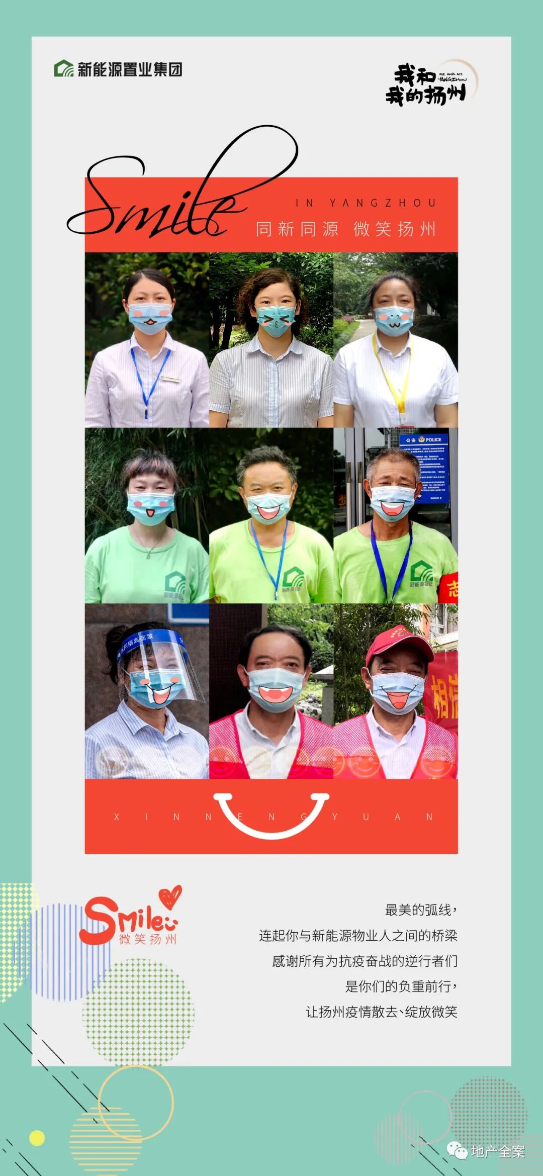 在探索“我和我的扬州”和美生活方式的中途,面对7月突发的扬州疫情,更加凸显了新能源与扬州的紧密联系,不仅仅是与城市,更多的是与人的紧密关系。在此期间新能源置业集团用积极向上的生活态度,温暖人心。同步开启微笑计划,用志愿者们的笑脸、小业主们的笑脸来温暖扬州。