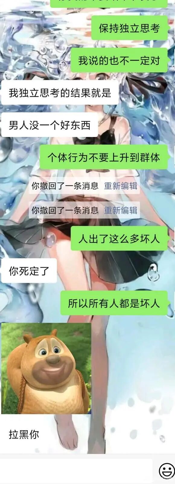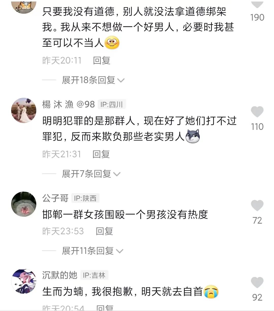 当然,你们依然可以因为这样一个不可控的小概率事件,就仿佛觉得自己身在水深火热之中,就觉得这已经是一个不公和混乱的社会,就骂所有男人,看最终矛盾更加计划社会更撕裂以后结果如何吧。我们正常男性,不会因为无端被骂去支持那些罪犯,但不可否认,原本同仇敌忾的心态也没了,替受害者发声的舆论氛围也变成正常男女互相消耗了。