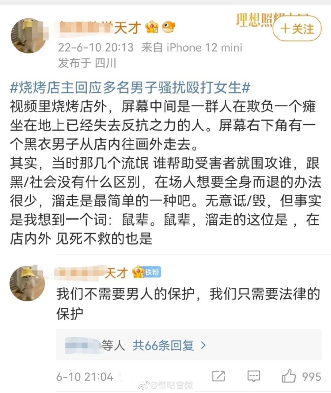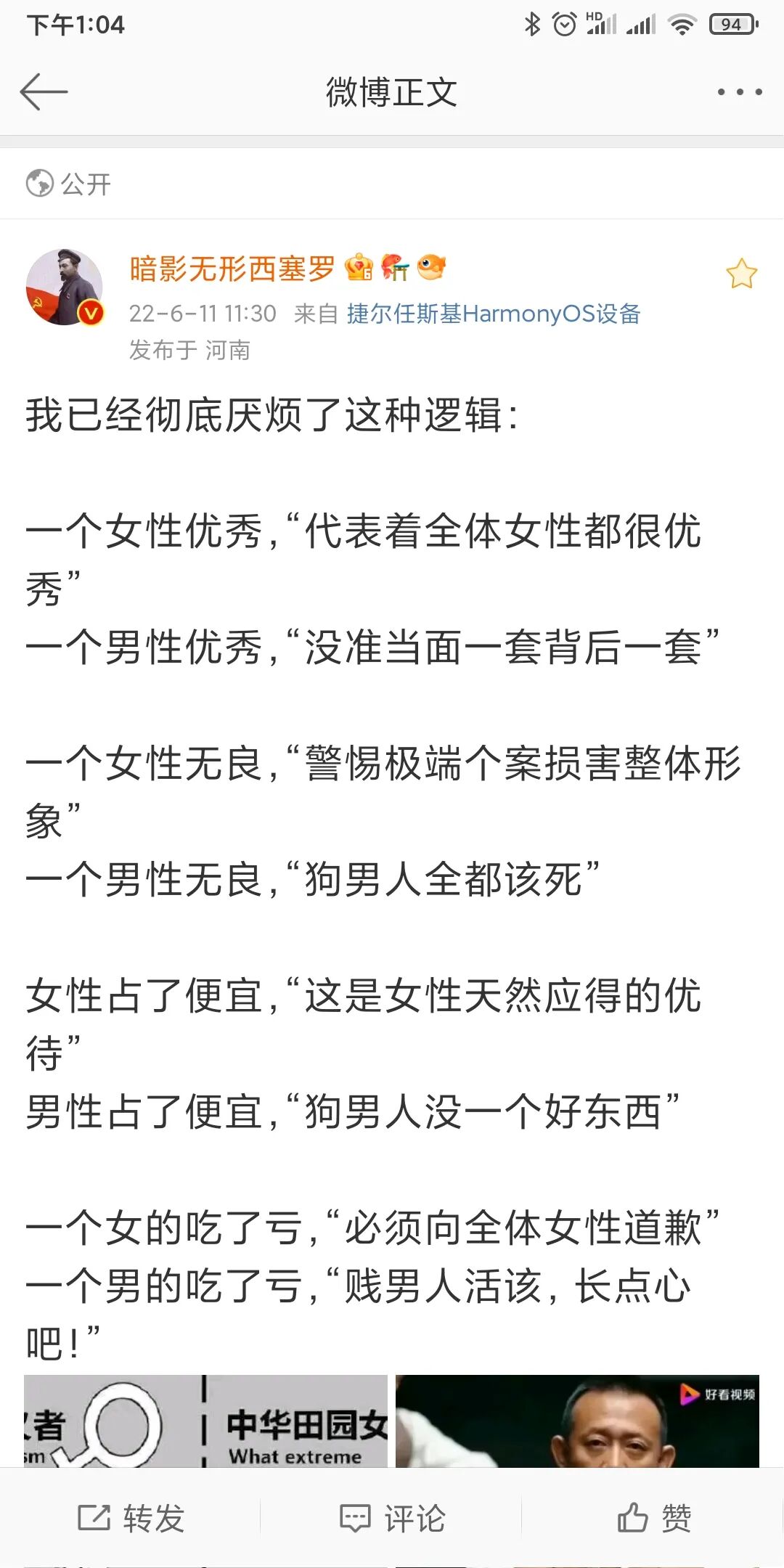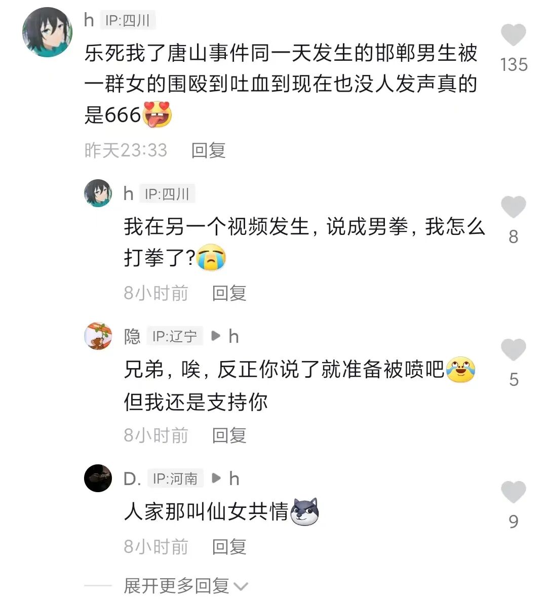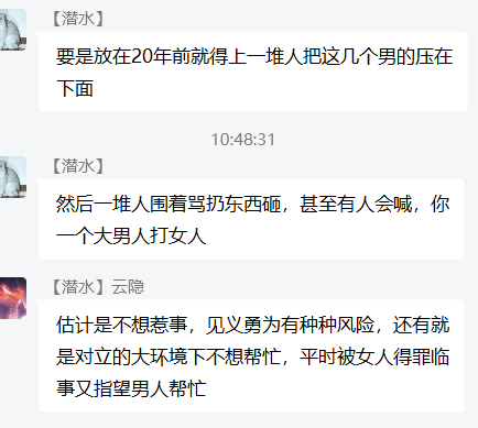 看到没有,荒唐的逻辑和理由,总是让仙女们无往不利。当然,这种事情仙女做得,国男们万万做不得,比如有国男在唐山事件下提到邯郸多名女子围殴男生事件,立马就会有仙女质问在唐山新闻下说这事是何居心,还给他扣上性别对立的帽子。虽然该国男只是用邯郸的新闻,反驳那些借唐山骂男人的仙女,并没有像上面的仙女那样,用对方性别负面新闻给同性别负面脱罪,更没有放出仙女般的豪言,比如“看到这个我觉得有些女人活该被打”来给受害者扣帽子,让她与另一个事件的施害者通过性别强行捆绑罪行共担。