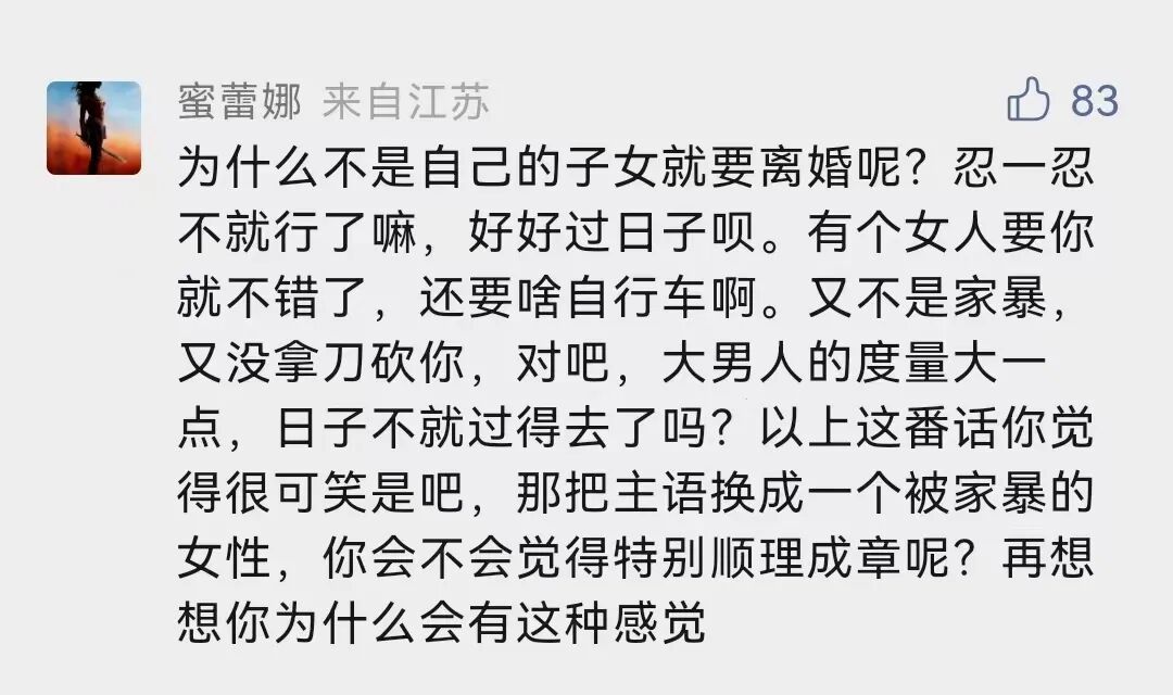 好一招无中生有暗度陈仓,虽然女人给你戴绿帽让你喜当爹了,但男人也有家暴的啊,所以男人应该忍耐。这就是仙女的逻辑,虽然两件事没有任何关系,事件中的两位男性也没有任何关系,但仙女们就是觉得,只要她指出其他男人的问题那这个男人就是活该,只要指出男性的问题那女性的问题就不存在。这位仙女还只是暗戳戳,下面这位仙女已经是明晃晃了。