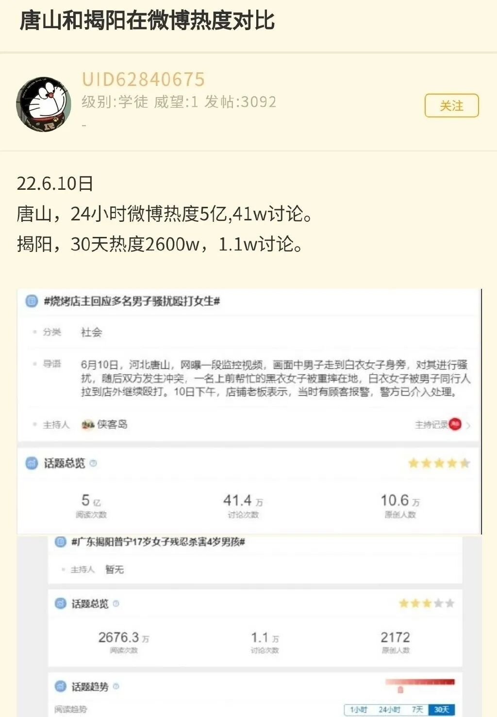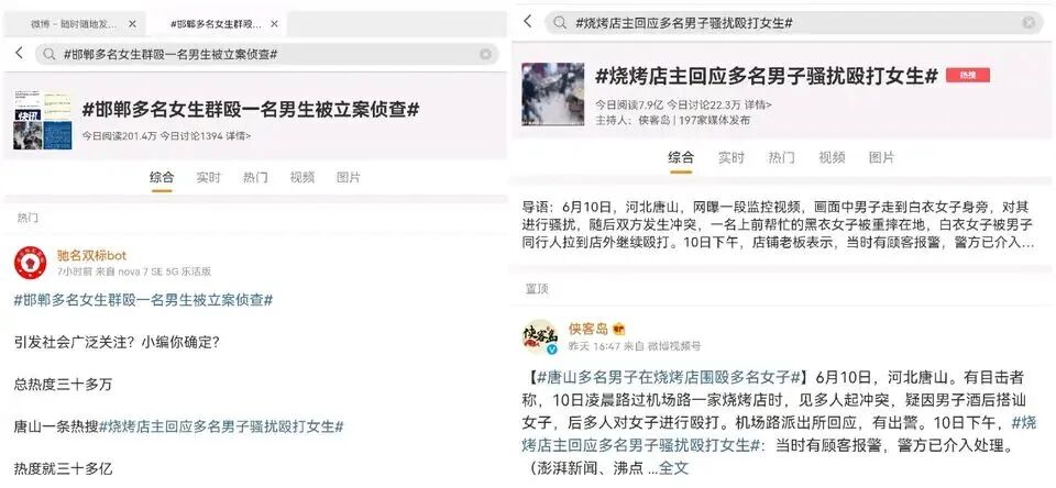 即便很多女性受害新闻,性别一换男性受害的也大有人在,比如碎尸案和跳楼事件,大家只知道受害者女,也只有女性作为受害者的事件上了热搜。实际上女性作为施害者伤害男性的案例也有,而且时间跟女性受害事件隔得很近,但就是鲜为人知。就拿唐山打人事件来说吧,这类恶性事件女性做的也不少,而且时间隔得很近,但就是没上热搜,我们来看一下。