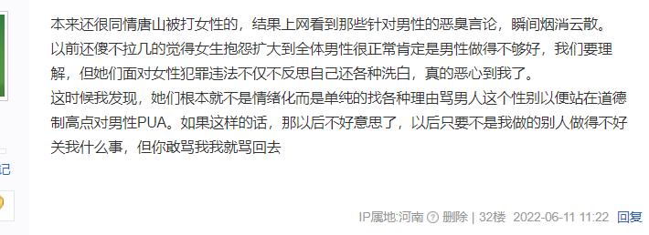 看到没有,成功将被戴绿帽的老实男和唐山暴徒挂钩,来强行为婚内出轨生别人孩子的女性洗白,并且给被喜当爹的丈夫扣帽子。这位仙女我从未看到她为被骗导致喜当爹的男人发声,我有理由相信她看到新闻就想为该事件的女性洗白,只是不好下口,于是唐山事件的新闻下她自认为终于逮到“机会”。可是,仙女们似乎忘了,这老实男人和唐山暴徒有什么关系呢?不仅没关系,恰恰这种老实男的性格,最不可能成为唐山暴徒那类,可她们就是要将两个男人联系在一起。她这样强行联系的底层逻辑是什么呢?明明身份不同不是同一个,性格不同不是同一类,唯一能联系的恐怕只有性别了。
