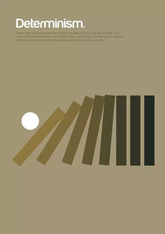 认为每个事件的发生,包括人类的认知,举止决定和行动,都是因为先前的事而有原因地发生。从原始宇宙开始,一连串的时间注定地,从未中断地发生,自由意志是不可能的。(电影《云图》,该电影中的世界是决定论的,不存在自由意志的)。从来就没有孤立的事件,每一个都是前因,也是后果。